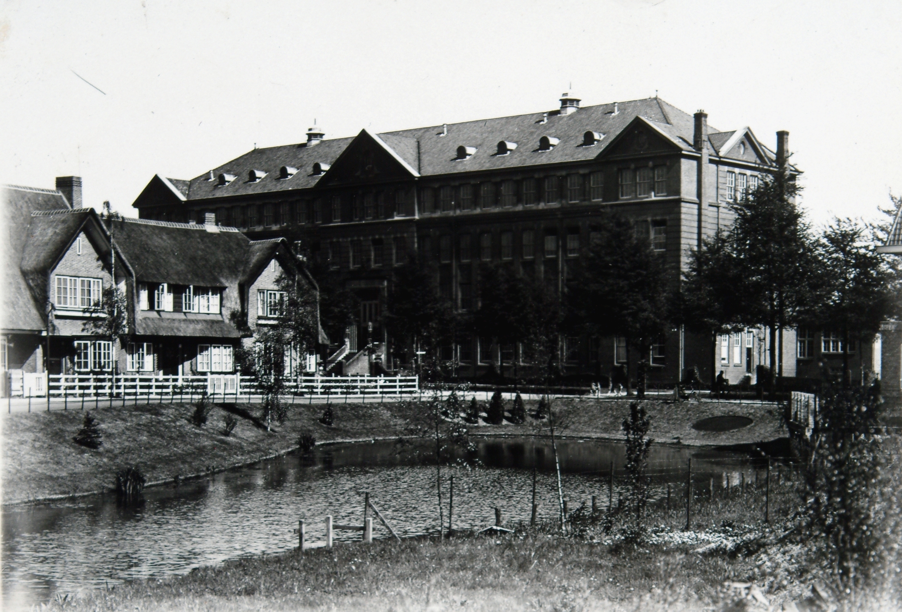 - De Noordhoveweg (links) komt uit op de Oranjelaan. Het gebouw is de voormalige M.T.S., de latere H.T.S. Op de vijver werd 's winters veel geschaatst.