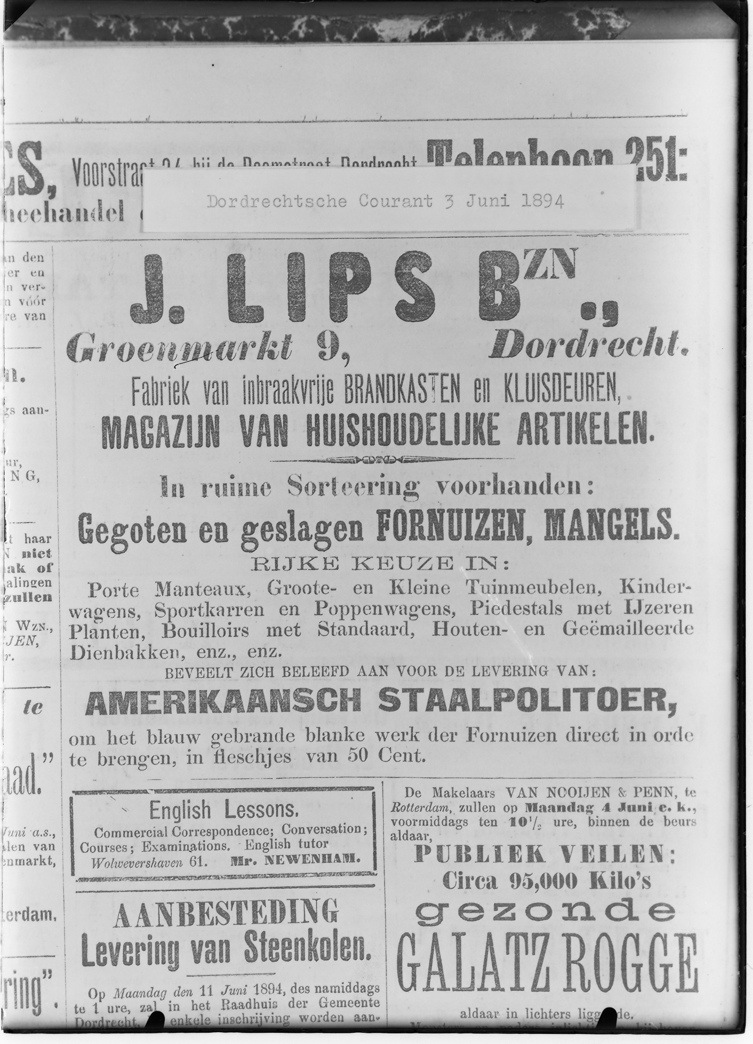 Foto van een advertentie van J. Lips Bz. Groenmarkt 9 uit de Dordrechtsche Courant van 3 juni 1894