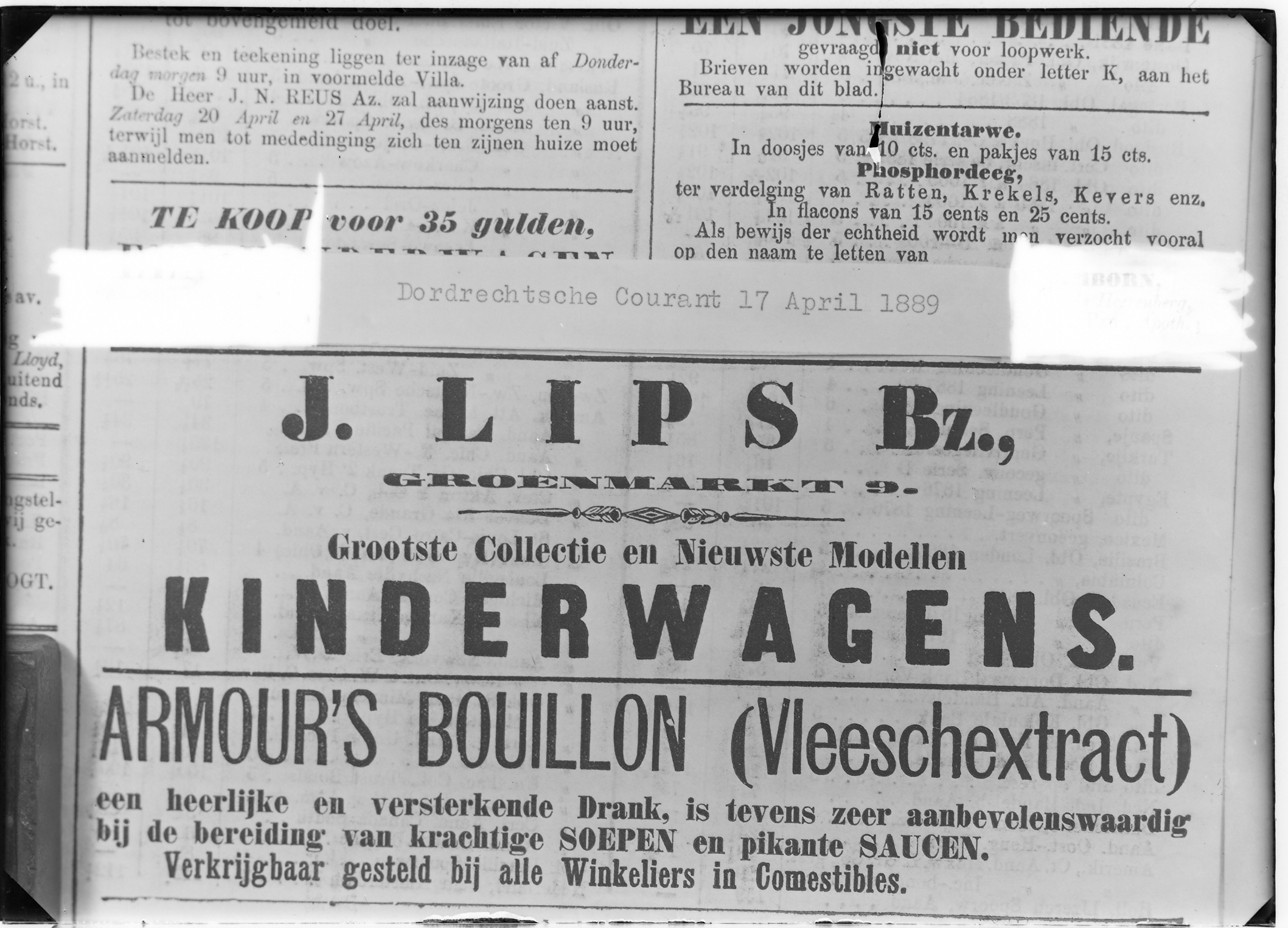 Foto van een advertentie van J. Lips Bz. Groenmarkt 9 uit de Dordrechtsche Courant van 17 april 1889 voor kinderwagens