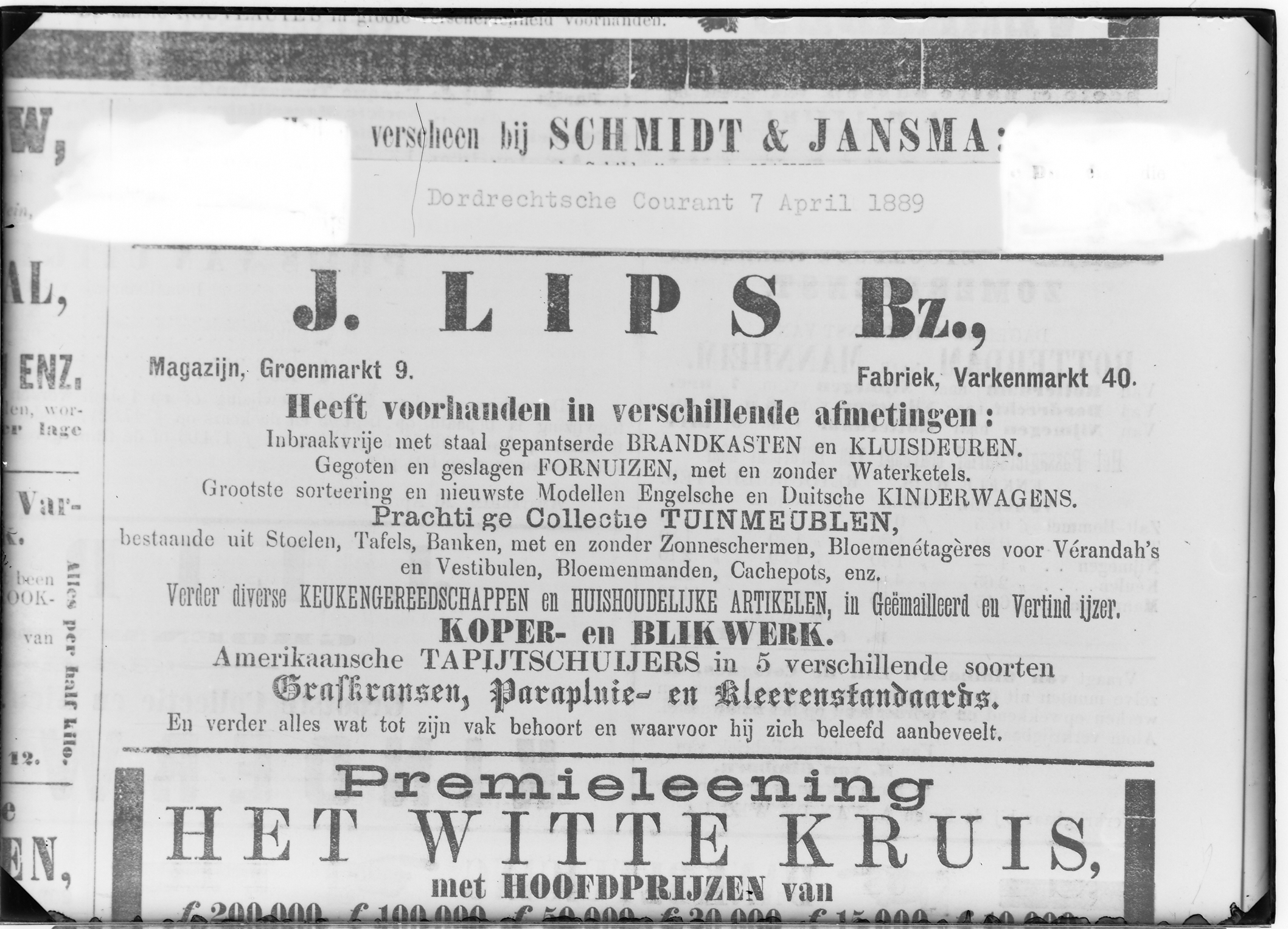 - Foto van een advertentie van J. Lips Bz. Groenmarkt 9 uit de Dordrechtsche Courant van 7 april 1889