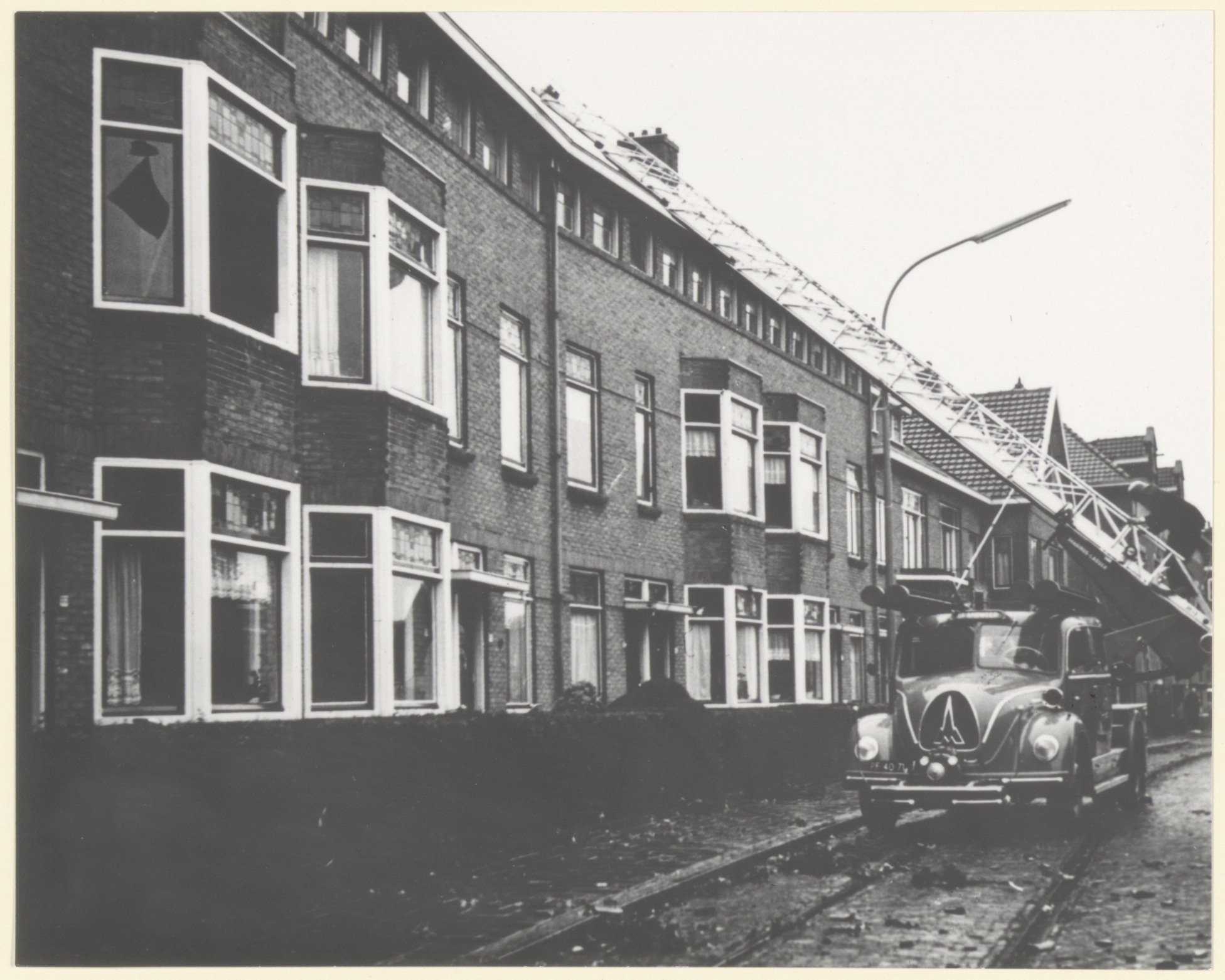 - De brandweer in actie op de Krommedijk na een windhoos op 12 januari 1961.