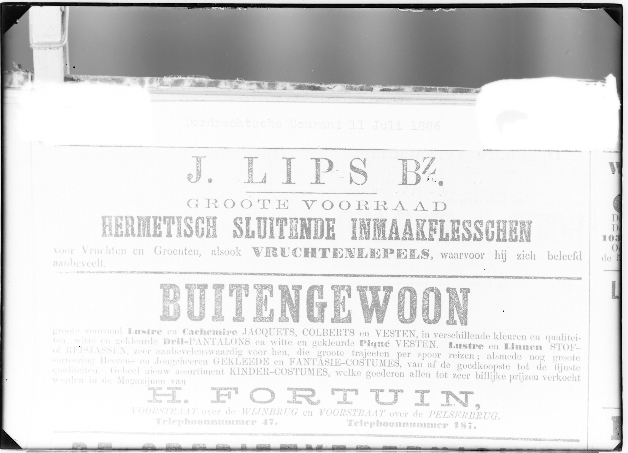 Foto van een advertentie van J. Lips Bz. Groenmarkt 9 uit de Dordrechtsche Courant van 11 juli 1886