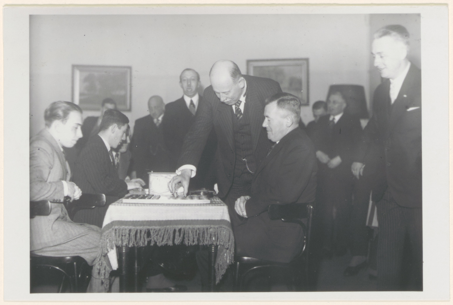 Burgemeester P.L. de Gaay Fortman doet de openingszet in de strijd tussen Vos en Raichenbach tijdens de wedstrijd om het Wereldkampioenschap Dammen in het N.A.B.-gebouw aan het Steegoversloot.