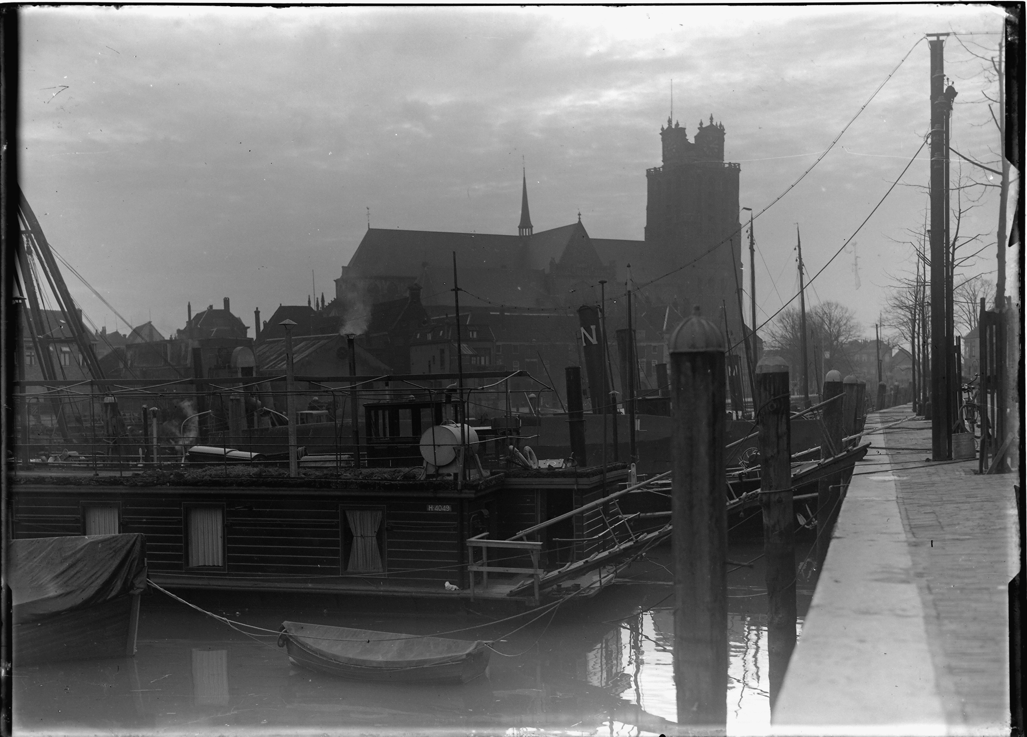 - Woonboot in de Nieuwe Haven. Op de achtergrond de Houttuinen en de Grote Kerk.