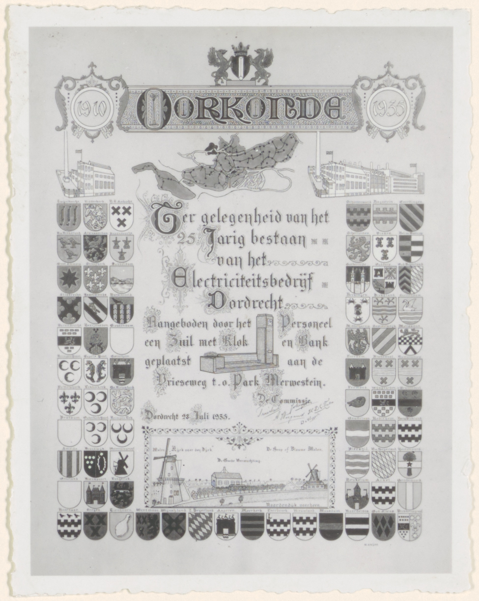 Oorkonde bij het geschenk van het vijfentwintigjarig G.E.B.: de bank met zuil en klok aan de Vrieseweg.