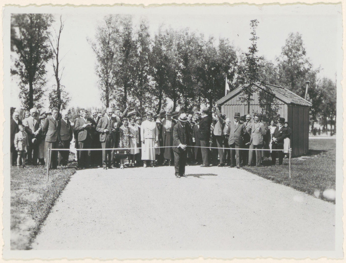 Wethouder J. Sanders knipt het lint door bij de opening van het nieuwe Wantijpark.