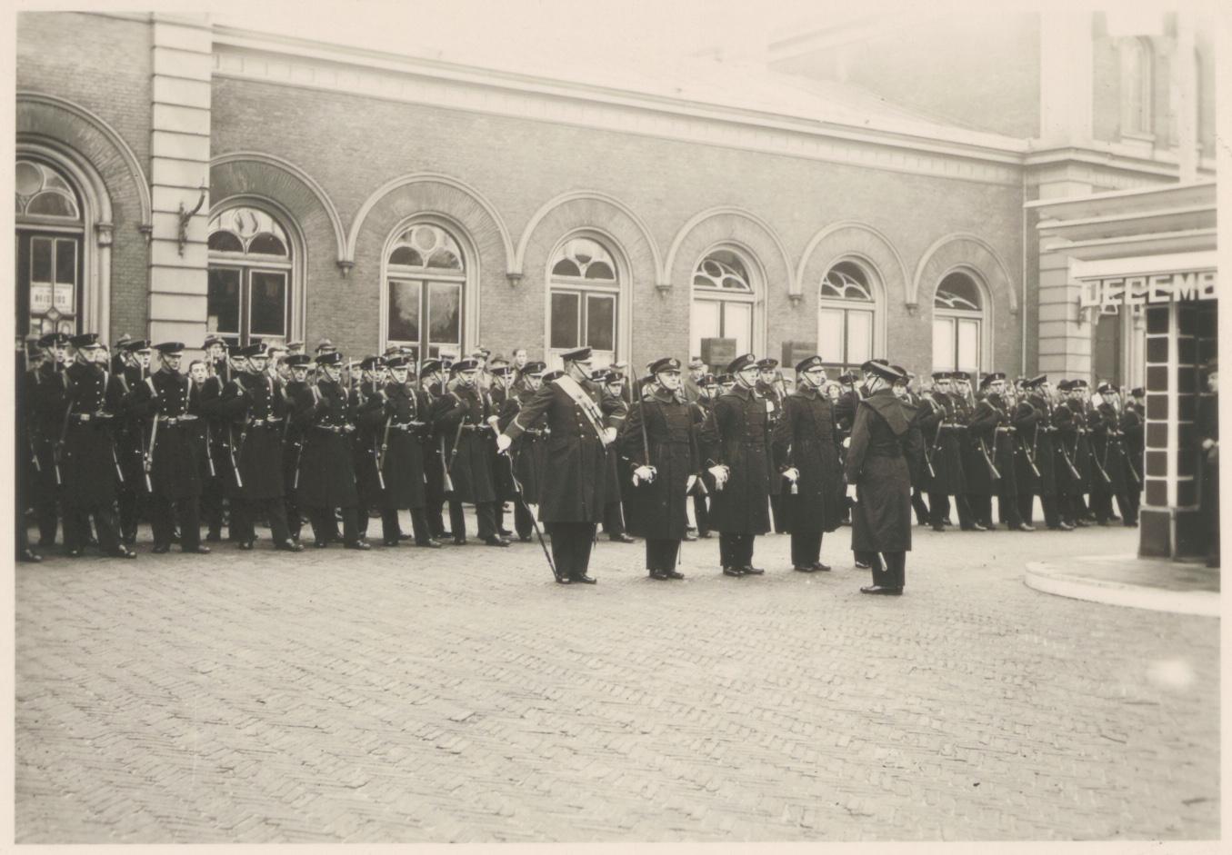 - Een detachement mariniers maakt een mars door Dordrecht en treedt hier aan op het Stationsplein.