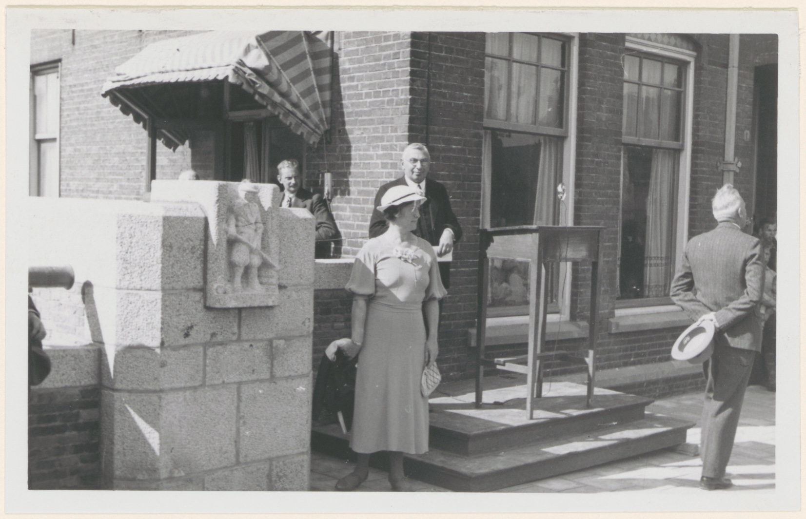 - Wethouder mevr. Smit-Pieters onthult beeldhouwwerken van Hildo Krop op de zojuist door wethouder I. van Huiden geopende nieuwe Leuvebrug.