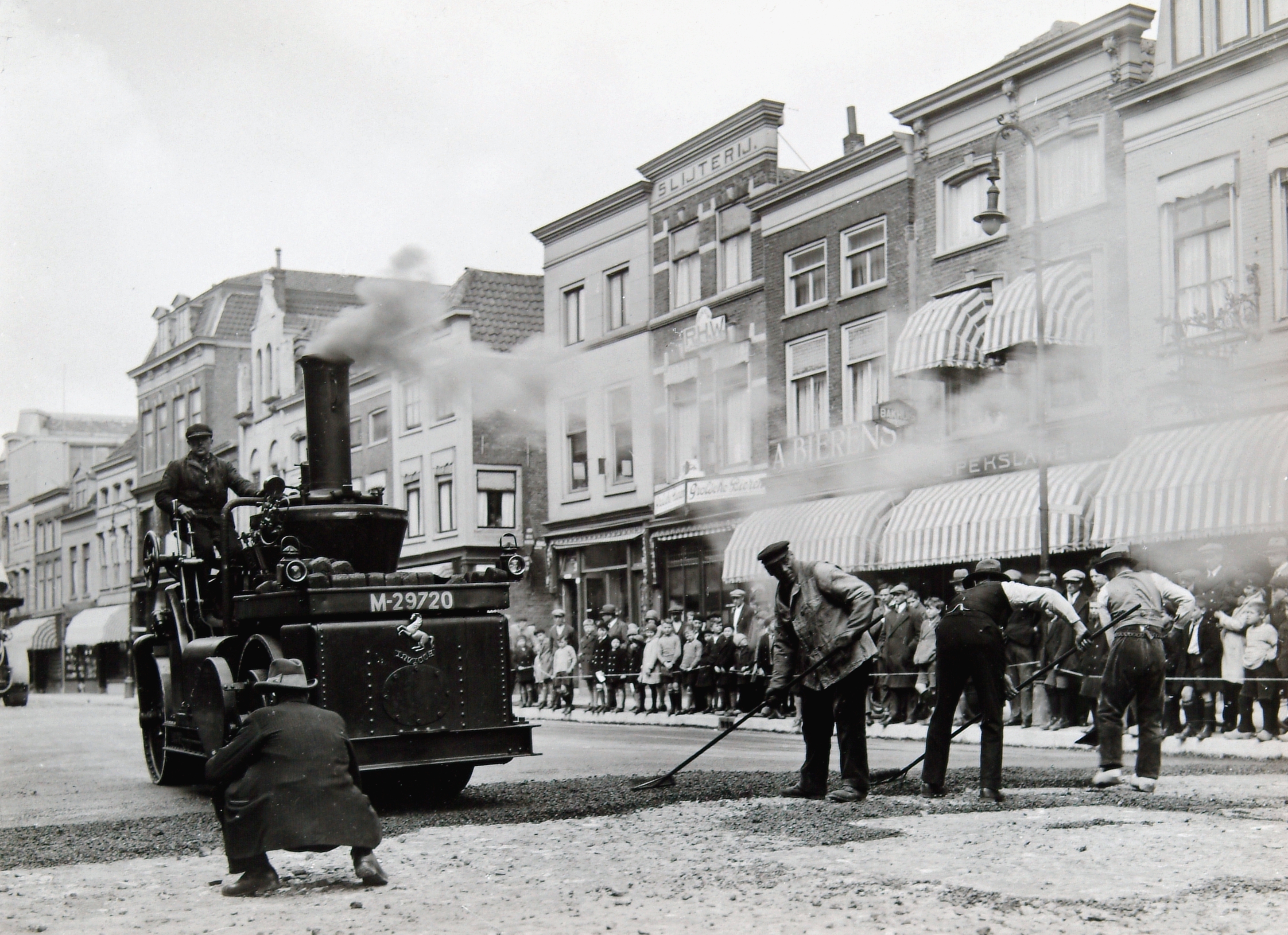 - Het walsen van het asfalt wegdek op het Bagijnhof, ter hoogte van de Sarisgang.
