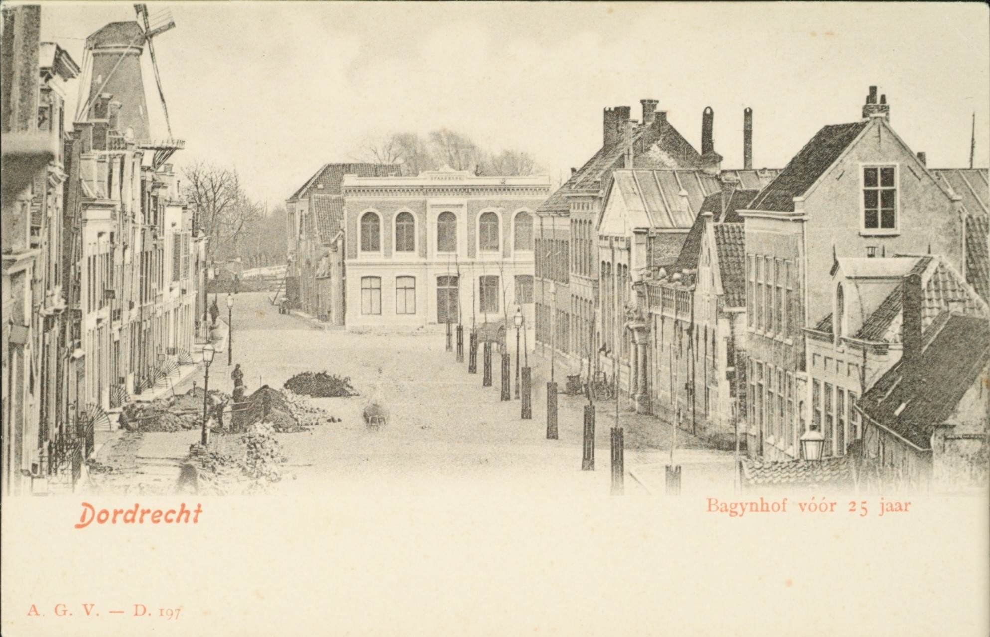 "De Spaarbank der Maatschappij tot Nut van het Algemeen werd opgericht 5 Mei 1818. Lang werden de vergaderingen gehouden in een der gebouwen in de Wijnstraat tegenover de Wijnbrug. De bloei dezer inrichting deed de behoefte aan een beter gebouw ontstaan, dat in 1875 aan het Bagijnhof verrees, en dat deel der stad tot een sieraad strekt. In de reglementen en verslagen dier instelling kan men verder de meeste bijzonderheden vinden, waarheen wij verwijzen." <<Dordrechtsche Courant, 1894-03-06>> "Dezer dagen is bet nieuwe Hervormde Bestedelingenhuis aan bet publiek ter bezigtiging gesteld en eerlang zal het geopend worden voor het doel, waartoe het werd gesticht. In eenvoudigen stijl en op een minder gunstig terrein gebouwd, levert het van binnen een aantal ruime en luchtige lokalen op voor dag-en nachtverblijf, verpleging van zieken, reiniging en verpozing, terwijl nog een aantal kleine vertrekken aanwezig zijn, waarin minder behoeftigen, die afgezonderd wenschen te leven, voor eene geringe wekelijksche bijdrage, zich kunnen besteden. Bejaarde behoeftigen, wier lot lang zóó treurig was, dat den menscbenvriend het hart bij de beschouwing bloedde, gaan thans eene betere toekomst te gemoet. Hun is voortaan nog een kalm einde van een vaak zorgvol en moeijelijk leven weggelegd. In plaats van morsige spelonken, waarin doorgaans de bedeelden der diakoniën hunne dagen moesten eindigen, gemengd onder menschen even armoedig als zij, zullen zij voortaan eene ruime warme huisvesting, zindelijke kleeding, gezonde voeding en zorgvuldige oppassing deelachtig worden, en zal tevens gearbeid worden om door toespraak en godsdienstig onderwijs hen tegen hun naderend einde voor te bereiden. Eere zjj den menschen vrienden, wier bijdragen deze stichting hebben mogelijk gemaakt. Maar eere zij ook den bouwmeester H. Boet, die een zoo ruim, hecht en doelmatig gebouw heeft weten daar te stellen, met middelen die daarvoor aan anderen niet toereikend schenen. <<Dordrechtsche Courant, 1849-10-30>> Het Herv. Bestedelingenhuis werd op 1 november 1849 met 40 oude mannen en 54 oude vrouwen in gebruik genomen.