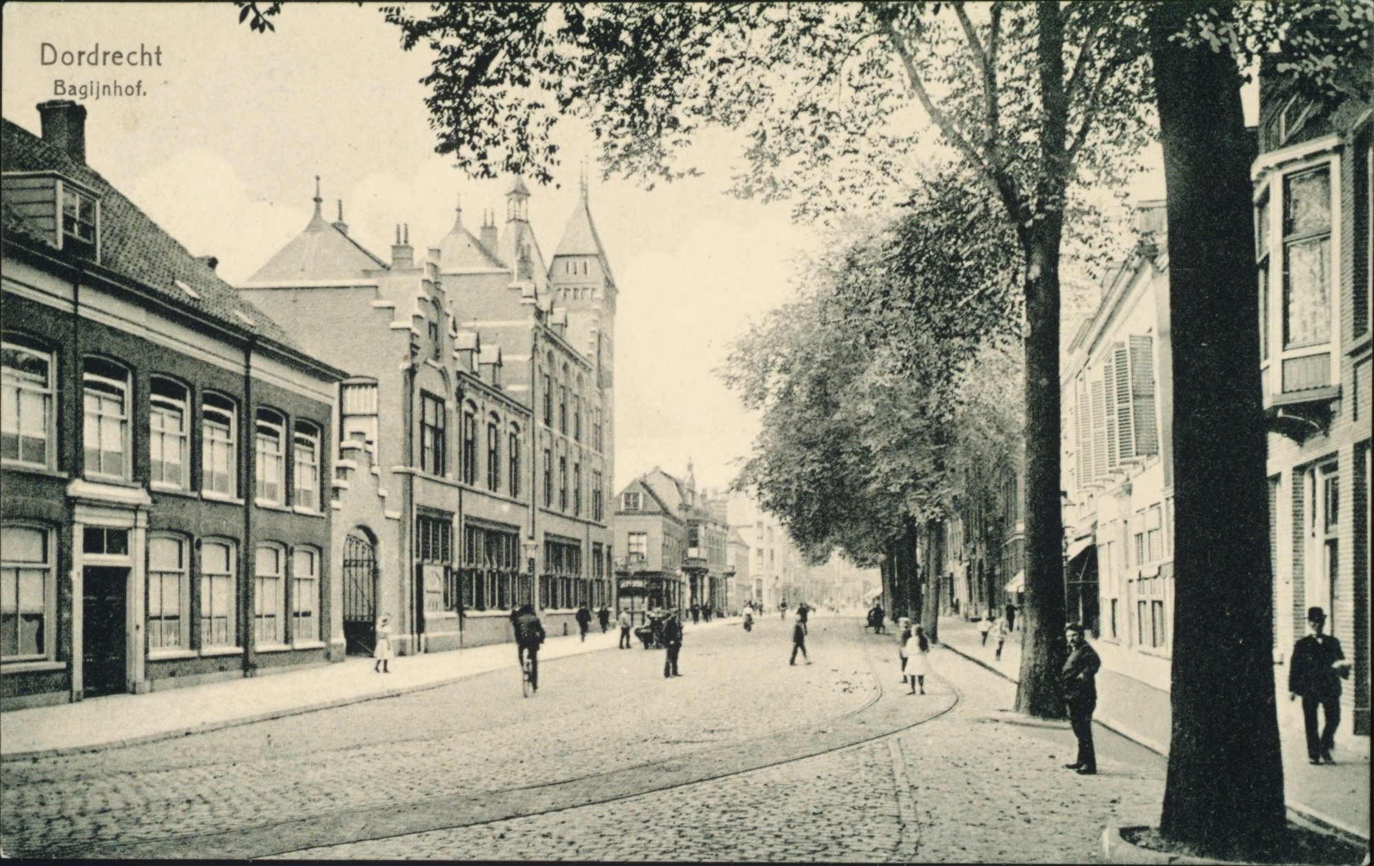 - Het Bagijnhof, gezien richting Visstraat. Op de voorgrond links het Bestedelingenhuis, verderop het postkantoor. De rails zijn van de paardentram.