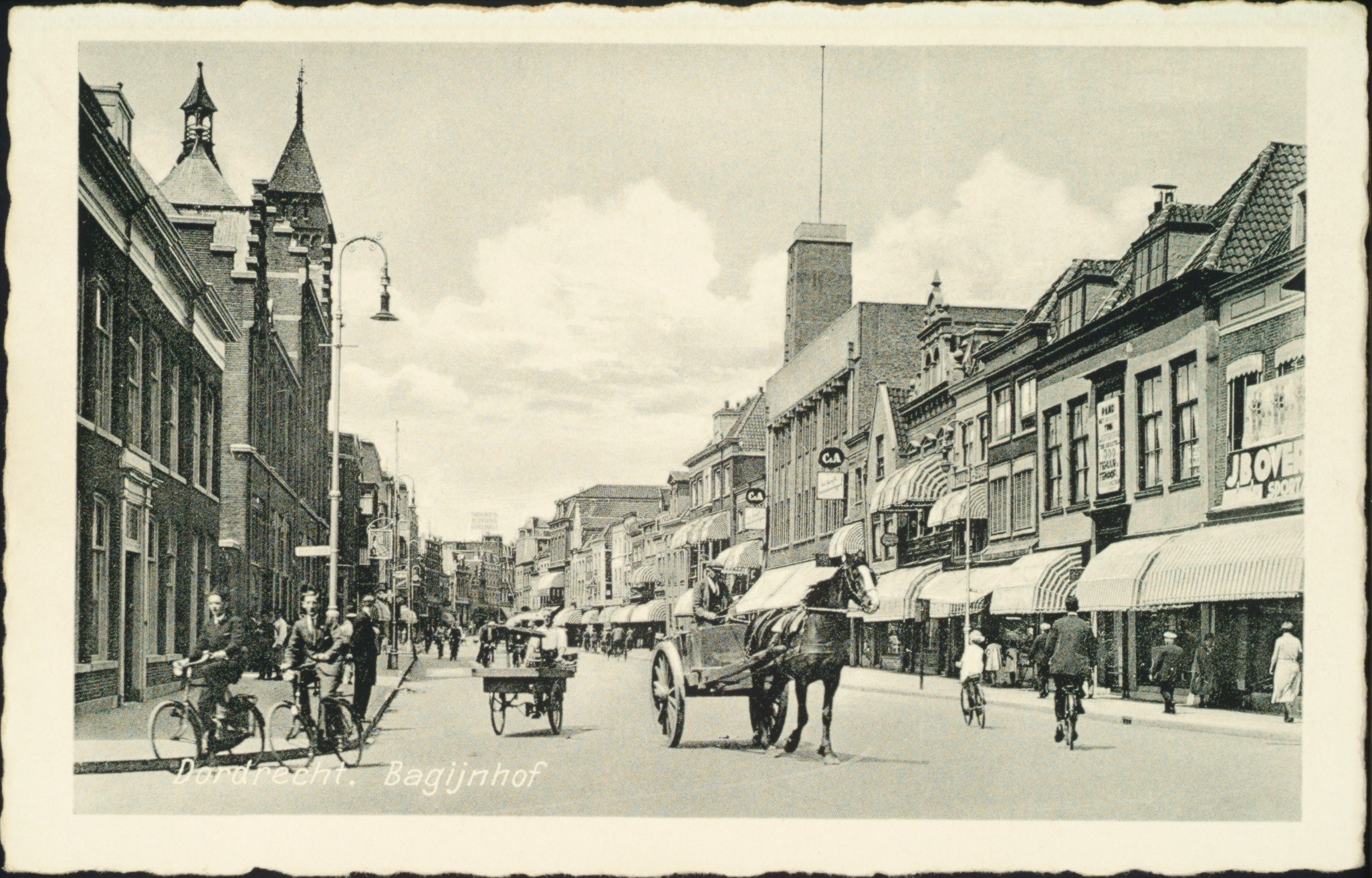 - Het Bagijnhof, gezien richting Visstraat. Op de voorgrond links het Bestedelingenhuis, verderop het postkantoor. Rechts C&A en Overwijn, beide kledingzaken.