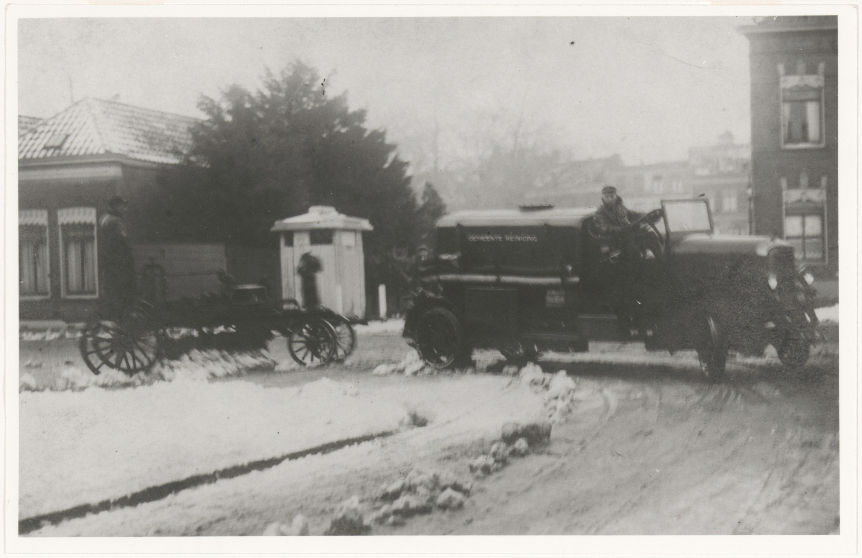 - Een sneeuwploeg, getrokken door de sproeiwagen van de reiniginsdienst, rijd van de Cornelis de Wittstraat de Blekersdijk op.