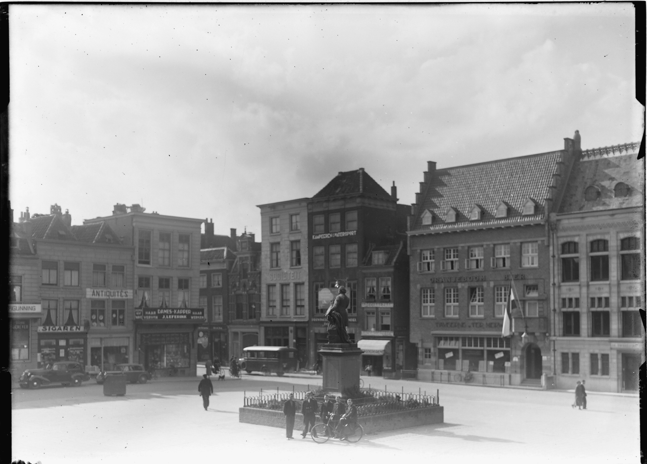 - Scheffersplein van Voorstraat naar Groenmarkt gezien. De sociëteit met dansschool was van Henk Eyskoot. Rechts daarvan ijzerhandel Mennens en Co. Naast de speciaalzaak in ondergoed ligt de Tolbrugstraat Waterzijde, dan taveerne Ter Merwe en de Twentsche Bank.