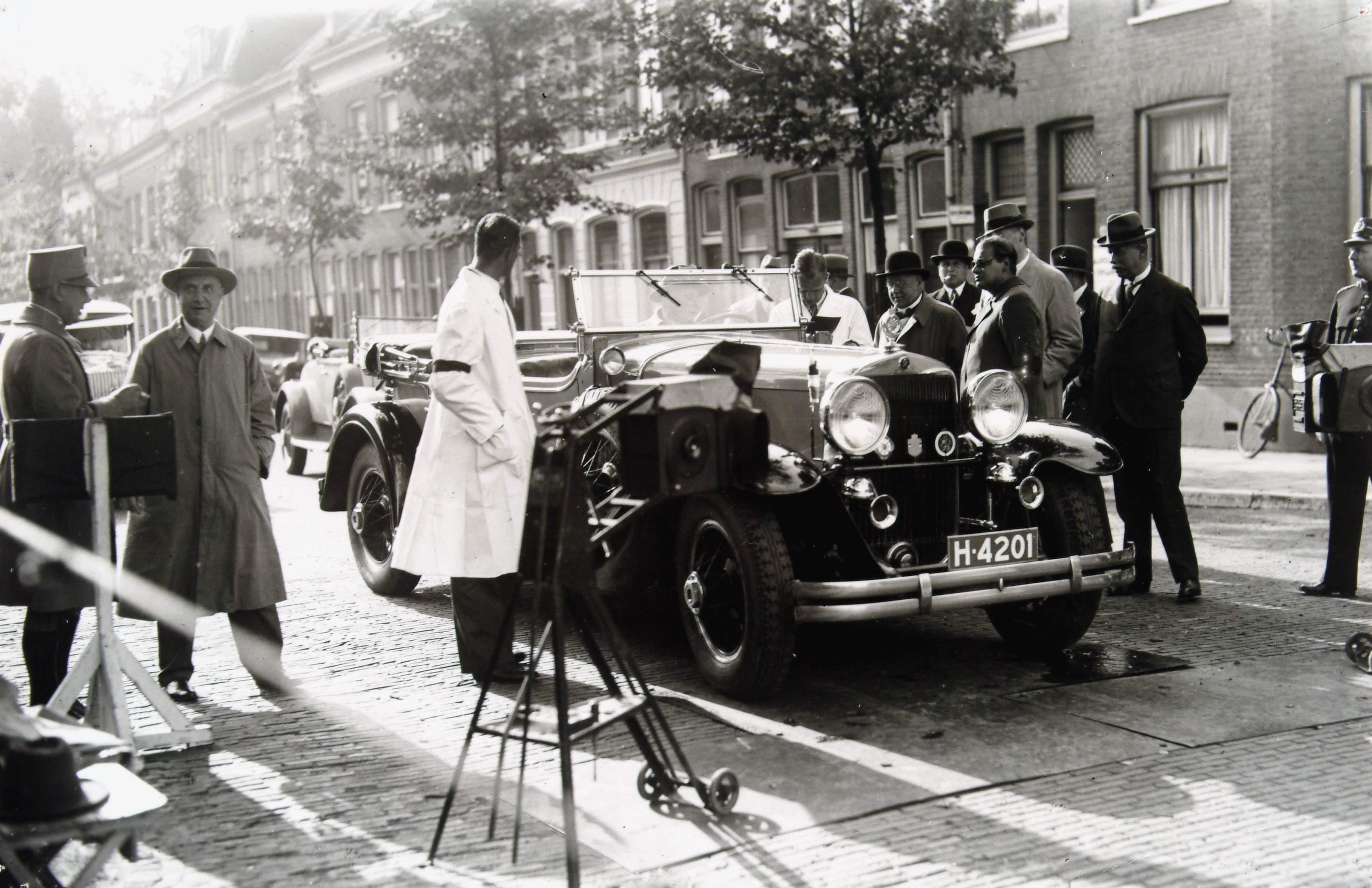 - Burgemeester De Roo van Dubbeldam is de eerste die zijn wagen laat onderzoeken in de Veiligheidslaan van de KNAC in de Cornelis de Wittstraat. 2e van links: W. de Wolf (met hoed) geheel rechts (met hoed): burgemeester De Gaay Fortman.