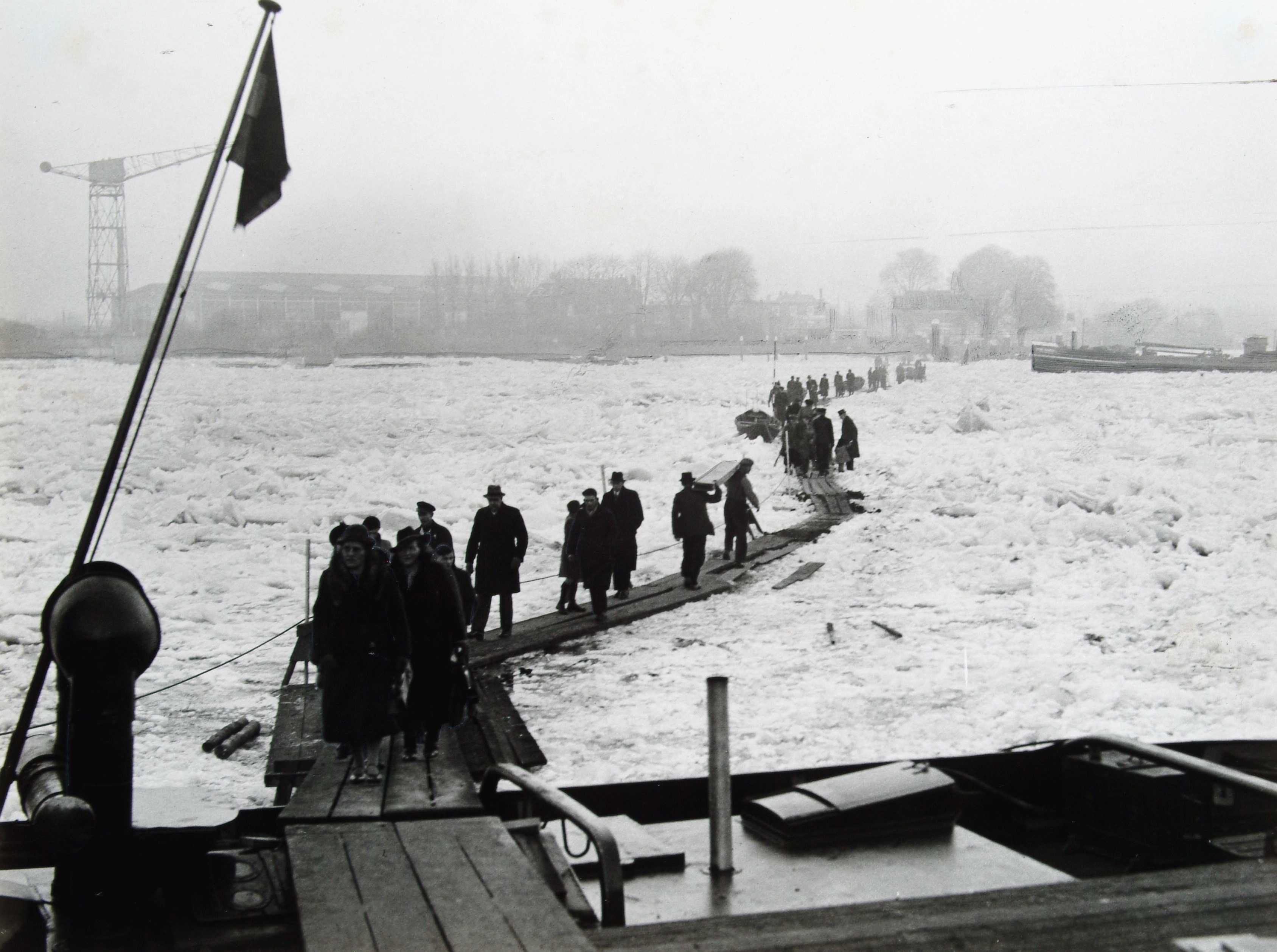 Bevroren Merwede vanaf het Papendrechtse veer in Dordrecht gezien.