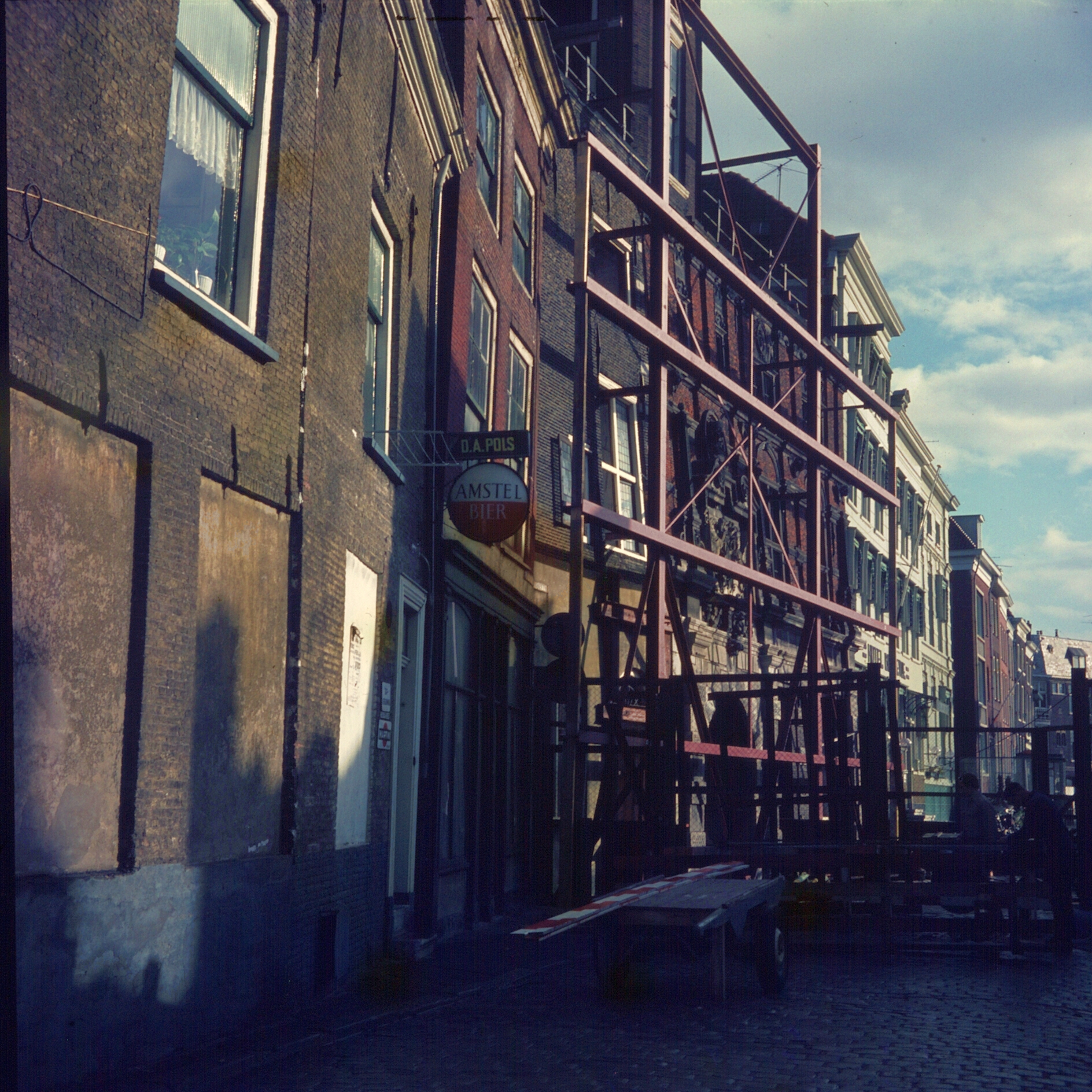 - De stalenconstructie, gezet ter stevigheid van het gebouw tijdens de renovatie van de Groothoofdspoort, gezien vanuit de Palingstraat.