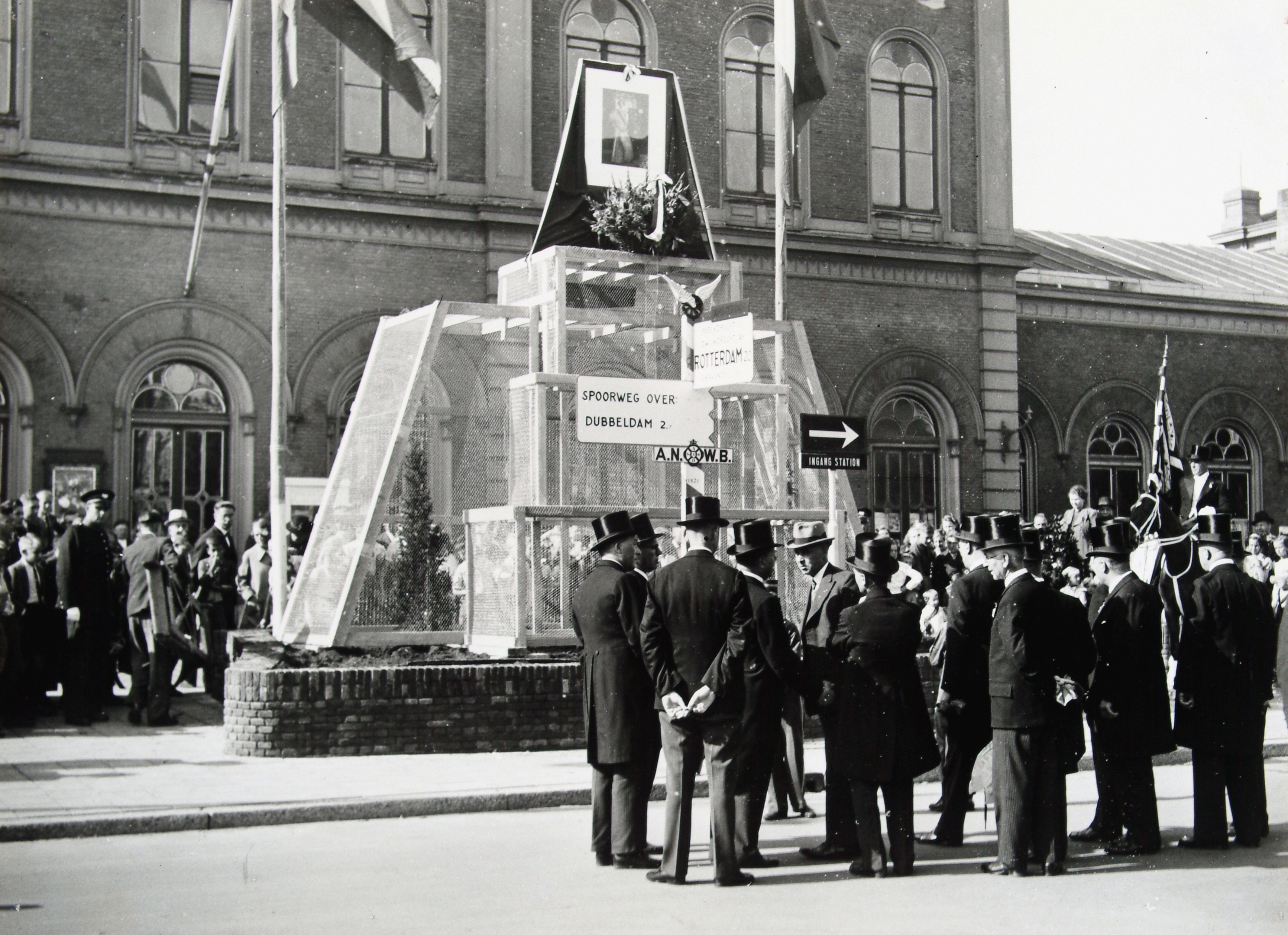 - besturen gedenktekens / monumenten oranjeverenigingen publiek / toeschouwers richtingborden / wegwijzers stations(gebouwen)