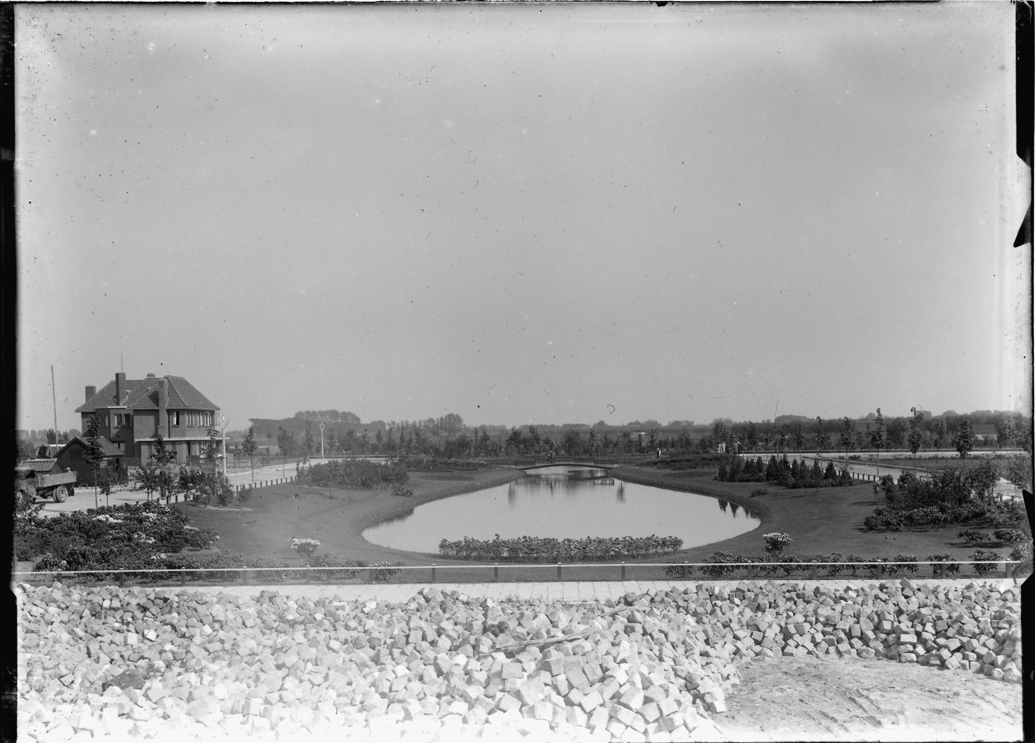 De nog onbebouwde Weedeweg Noordzijde (links) en Zuidzijde gezien vanuit de Standhasenstraat richting Twintighoevenweg op het Land van Valk. De grote woning staat aan de Twintighoevenweg.