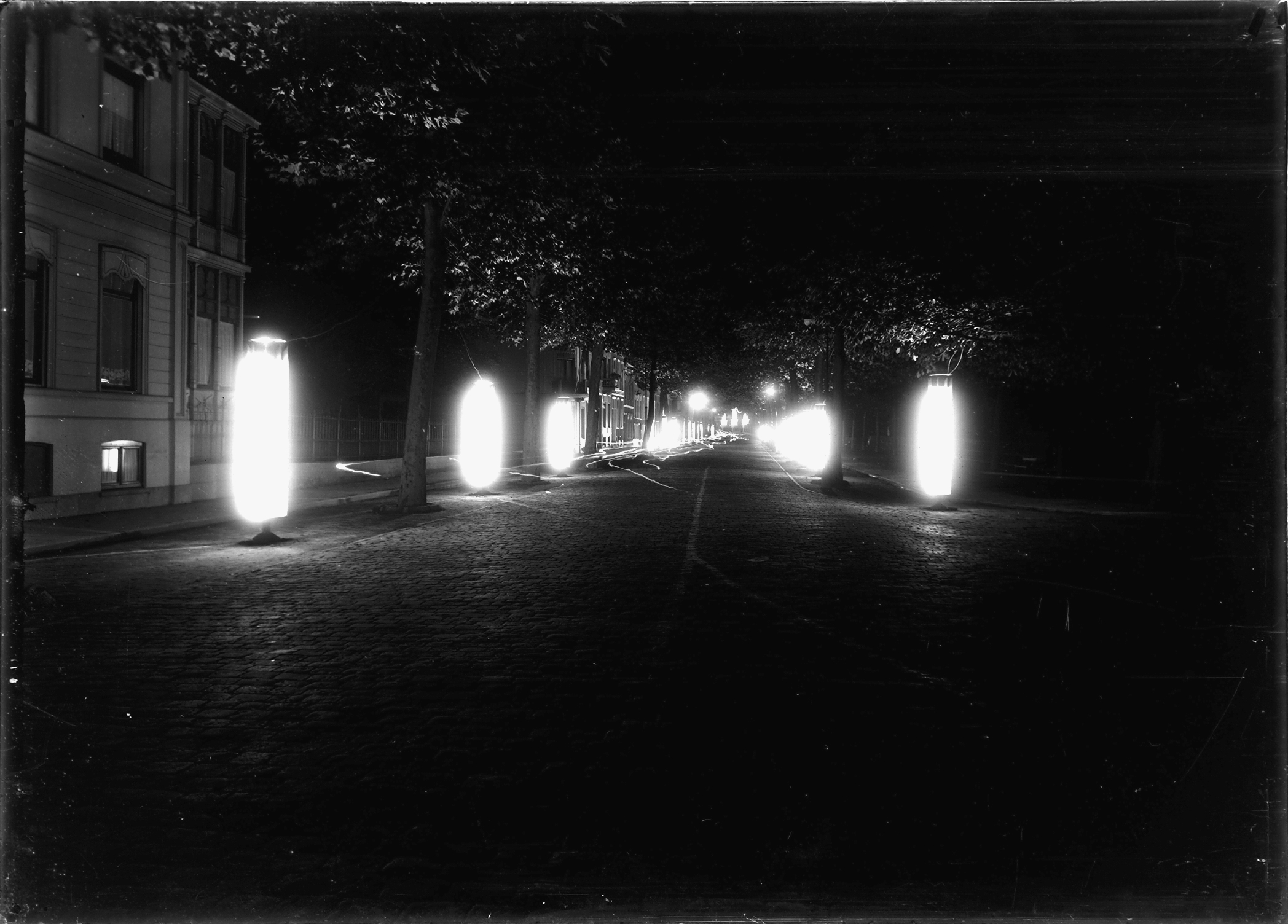 De Johan de Wittstraat gezien vanaf de Singel in de richting van de Johan de Wittbrug. T.g.v. de opening van de zeehaven werden feesten georganiseerd en was een groot deel van de binnenstad met speciale lampen verlicht.
