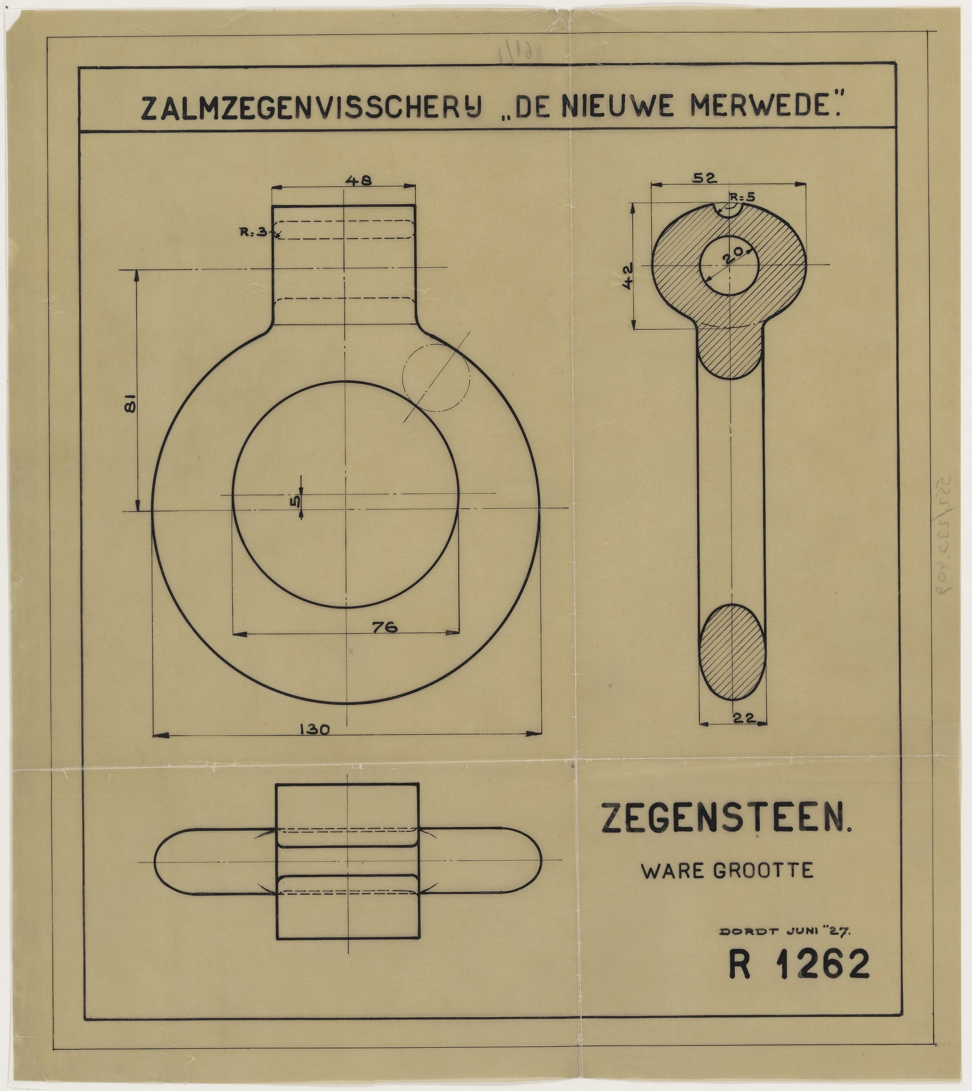 - Ontwerptekening van een zegensteen voor zalmzegenvisserij De Nieuwe Merwede.