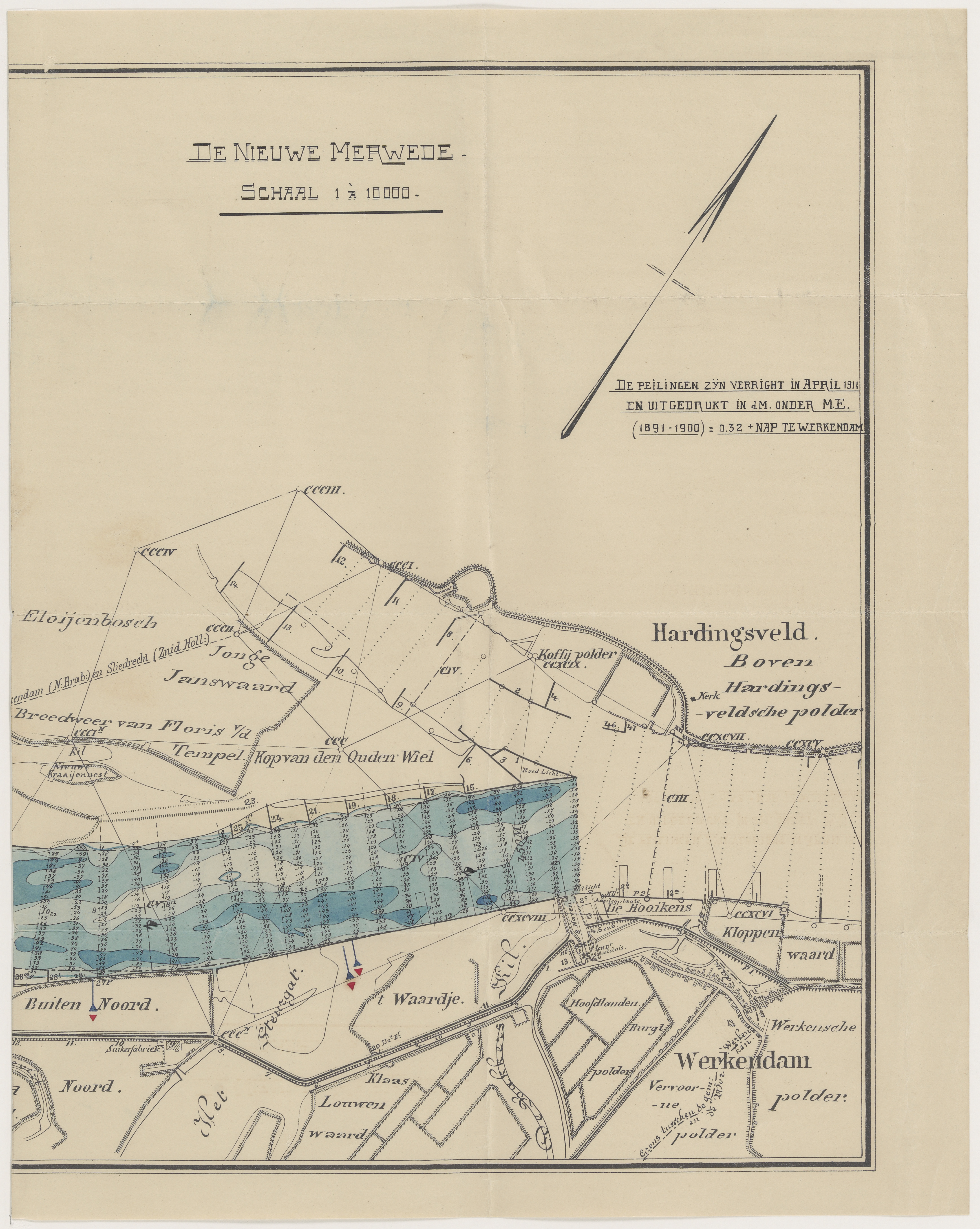 - Kaart van de Nieuwe Merwede t.h.v. Hardinxveld en Werkendam met ingekleurde dieptepeilingen.