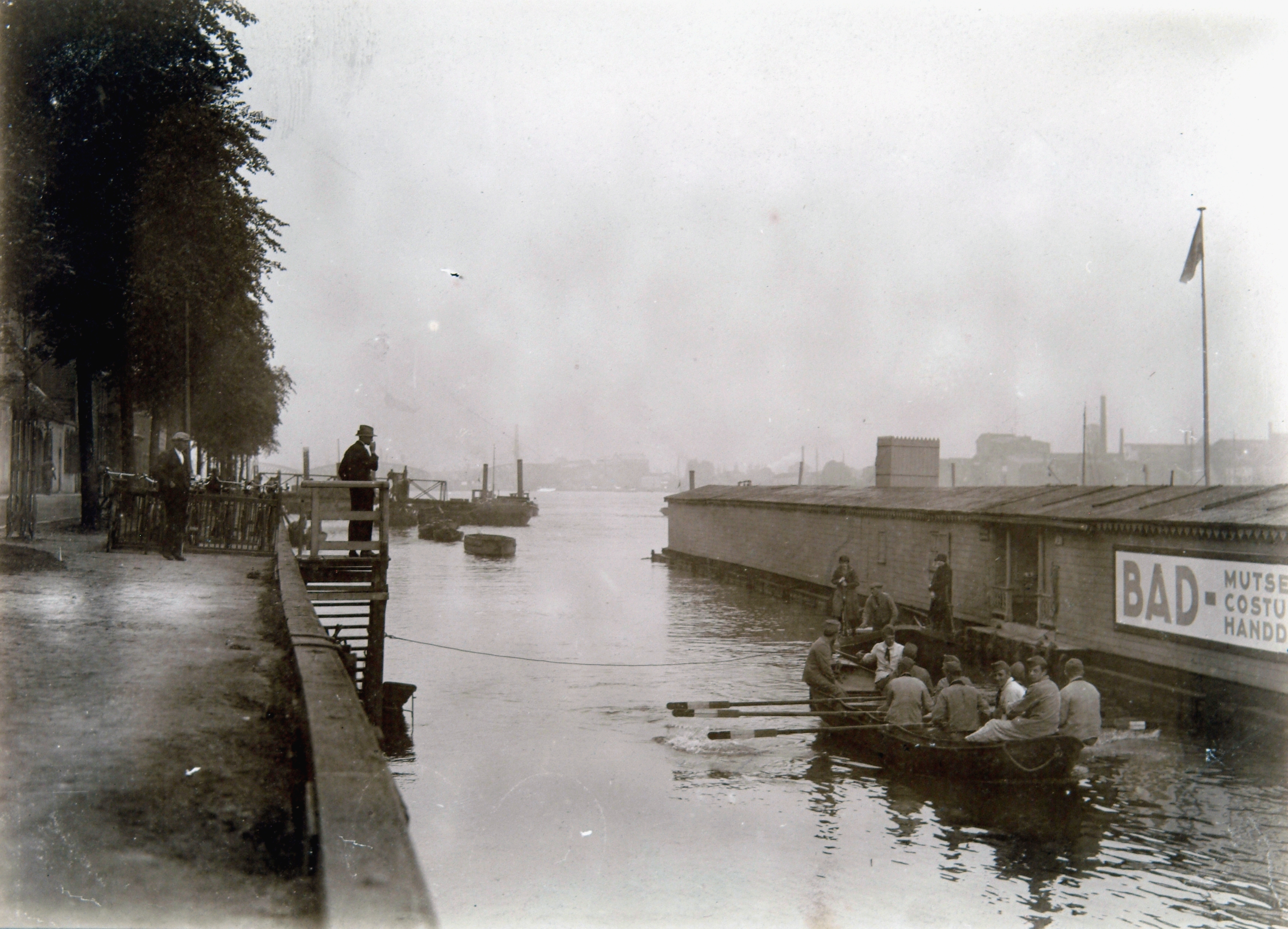 - Gezicht op de zweminrichting op de Oude Maas aan de Buiten Walevest; aan het eind van de Buiten Walevest is de steiger van de pont naar Zwijndrecht te zien. In de linker sloep zitten soldaten.