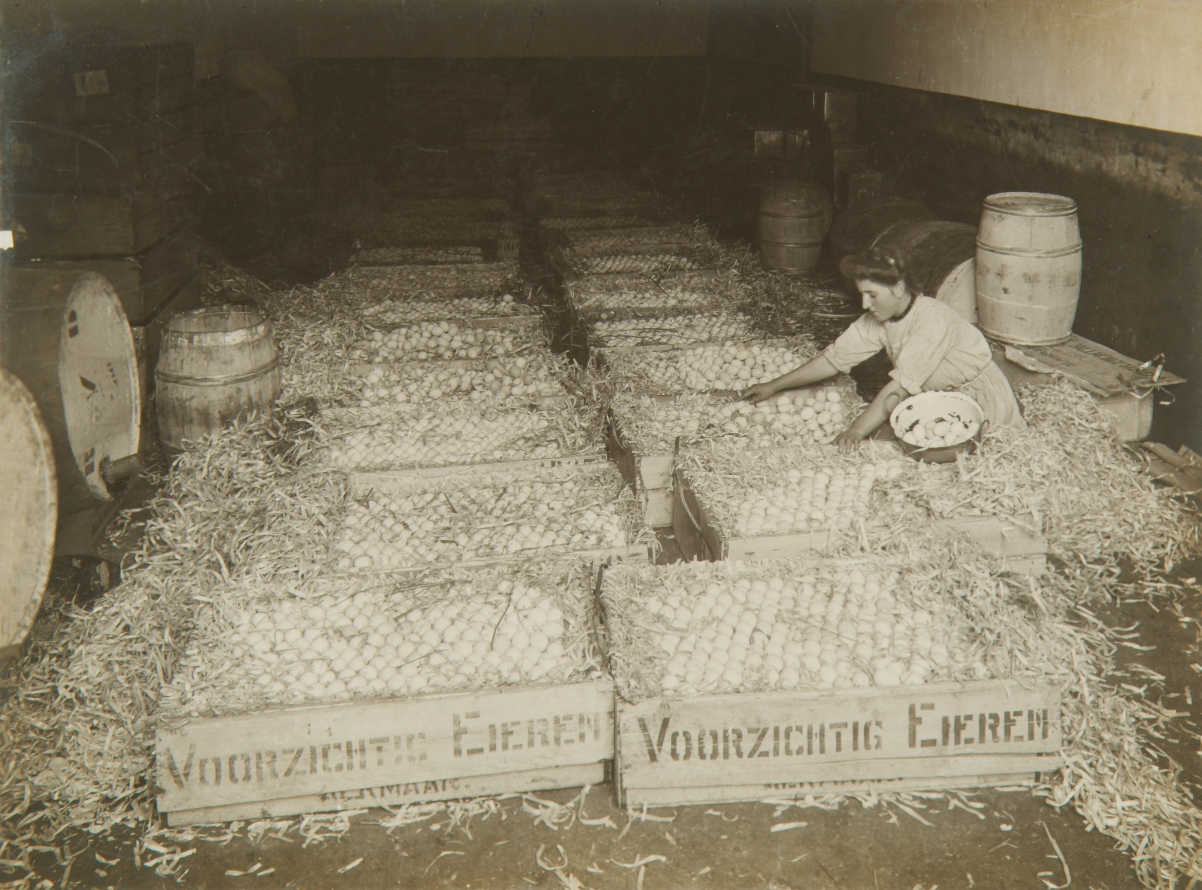 Voorraadruimte met eieren van koekjesfabriek Victoria aan de Korte Parallelweg.