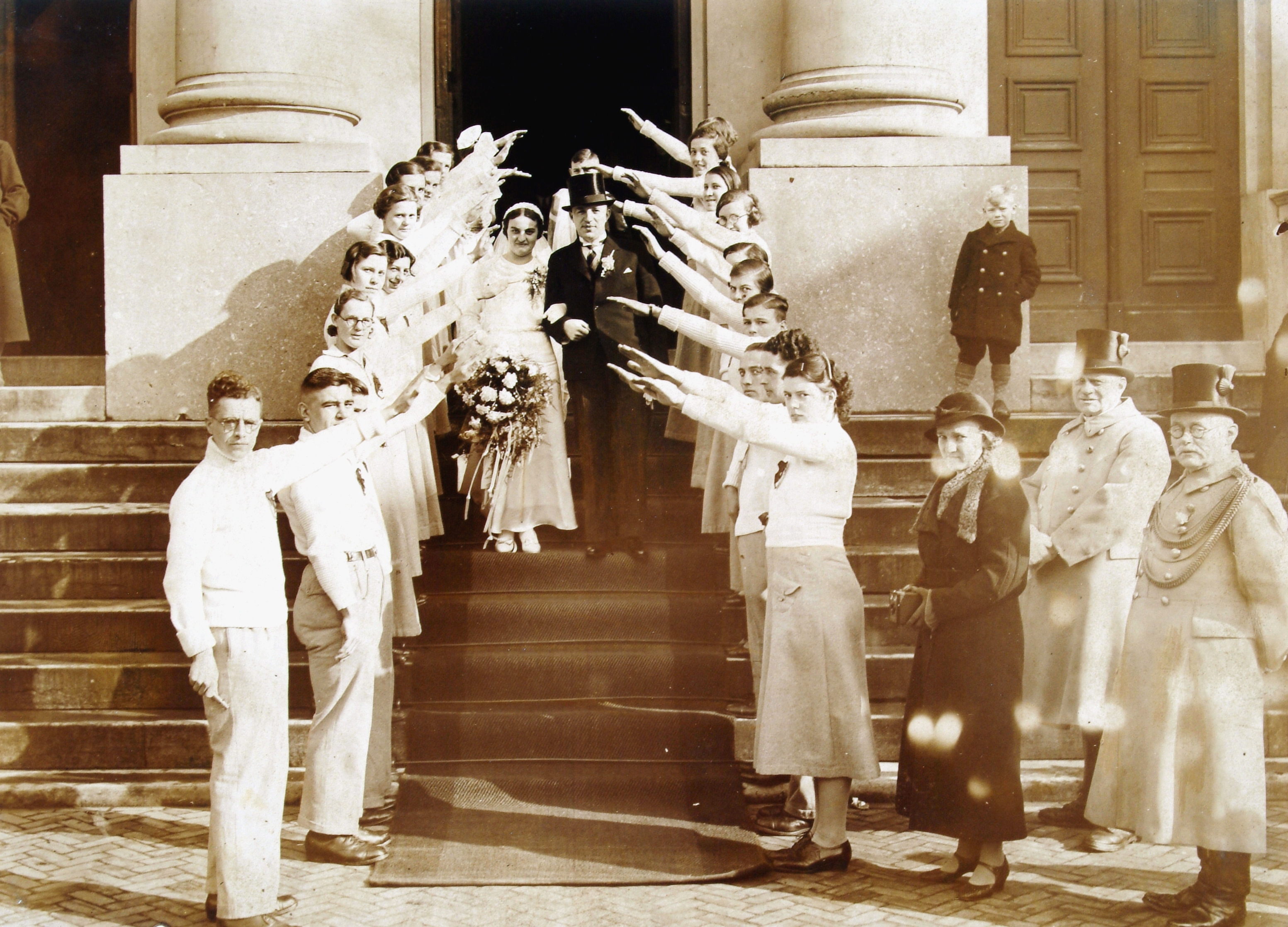 Een haag van Oranje Wit-leden op de trappen van het stadhuis bij het huwelijk tussen …