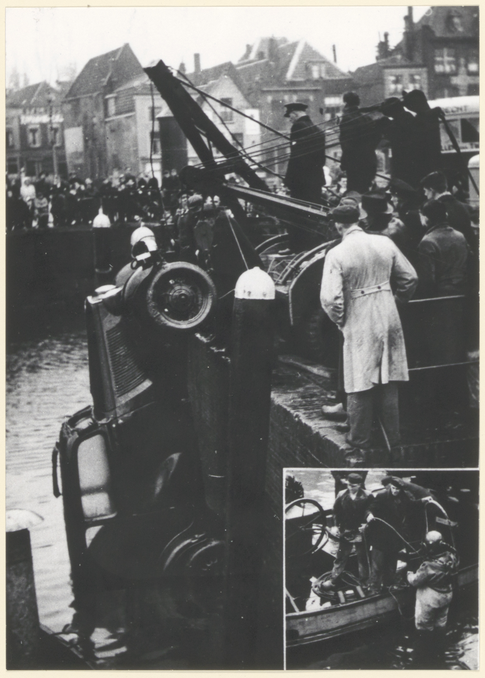 - De brandweer takelt de auto van dhr. D. v.d. Duyn Schouten uit Slikkerveer uit de Wolwevershaven, vanaf het Vlak; op de achtergrond de Aardappelmarkt en de Knolhaven. Inzet: een toevallig aanwezige duiker daalt af om te onderzoeken of er personen in de auto zaten; dat was gelukkig niet het geval.