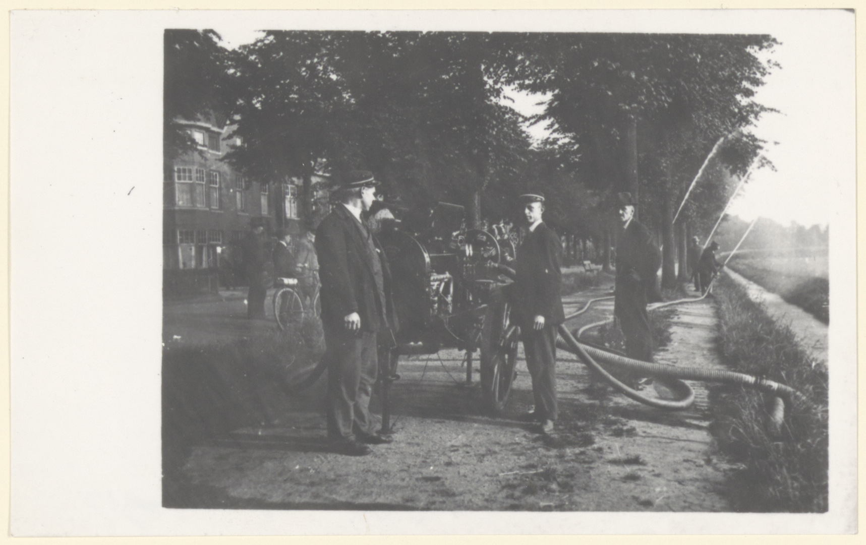 - Beproeving van de motorspuit Krispijn op de Krispijnseweg tegenover de Tollenstraat. Links J. Lagendijk, rechts dhr. Van Nugteren.