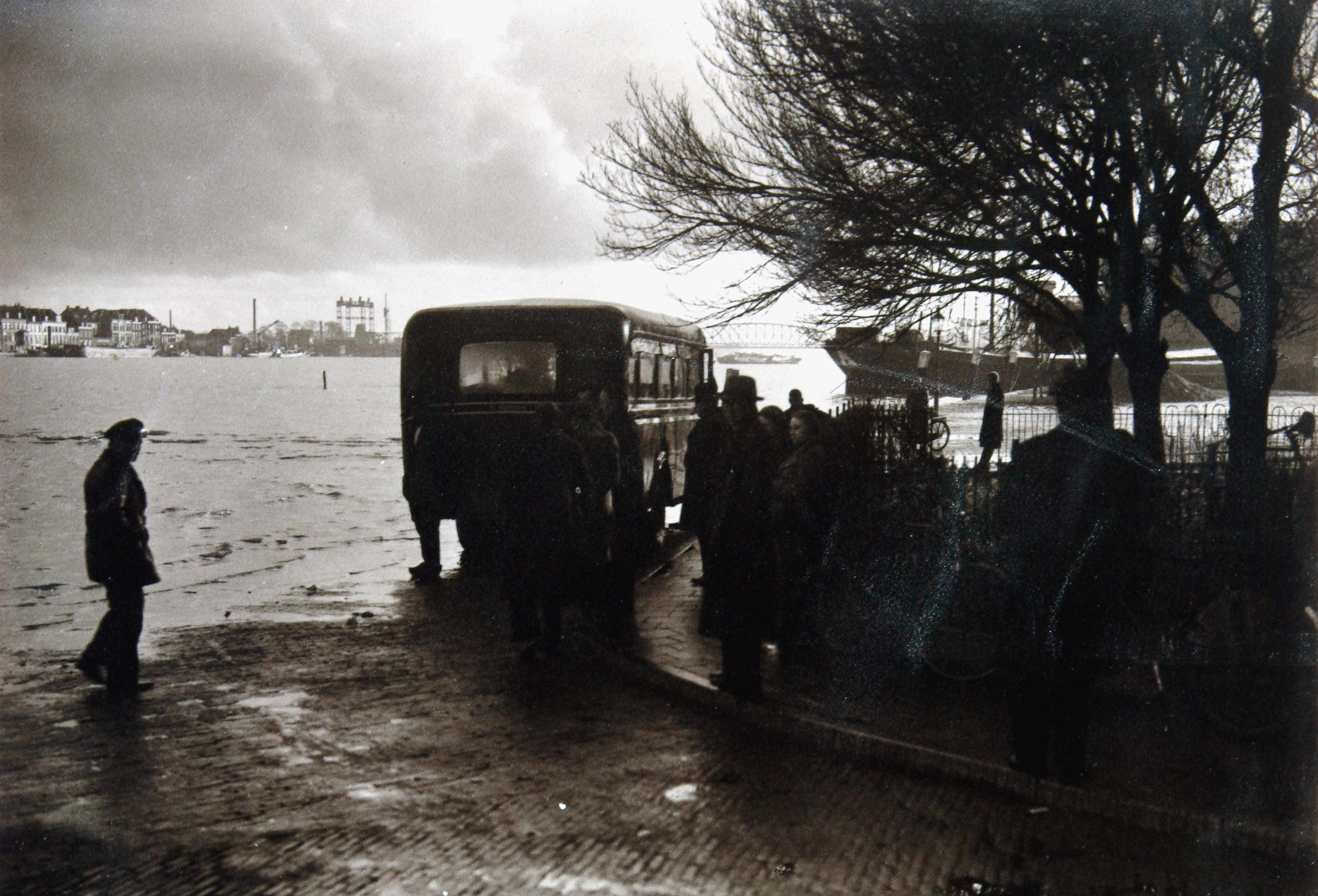 Het hoge water overspoelt het Maasplein en het Veerplein in Zwijndrecht. De foto is genomen vanaf hotel Het witte paard in de richting van de spoorbrug. Links van de bus zijn de heftorens van de Dokbrug zichtbaar.