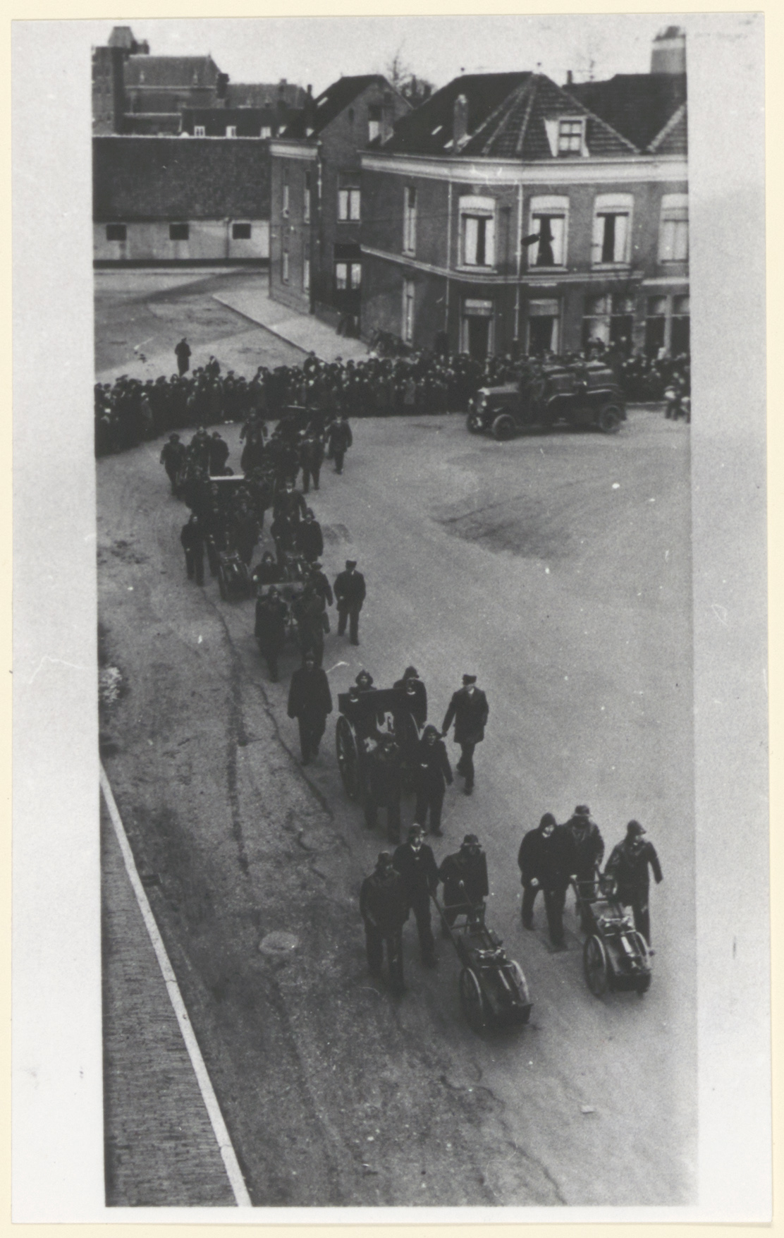 - Optocht op het Beverwijcksplein naar aanleiding van het 10-jarig bestaan van de Dordtse Brandweervereniging; op de achtergrond de Lange Loods in de Cornelis de Wittstraat.