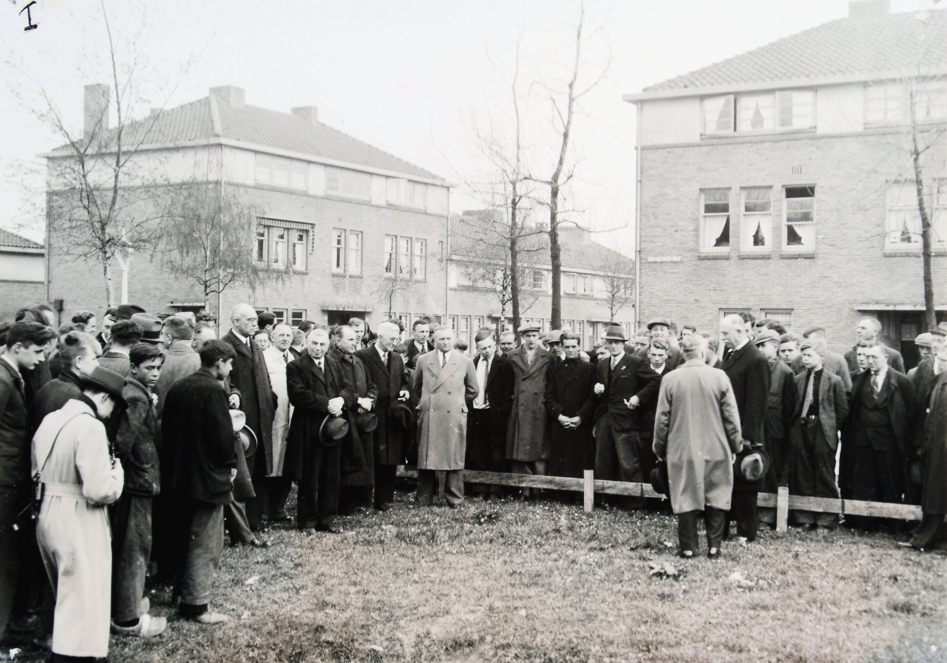 Burgemeester De Gaay Fortman zal de eerste spadesteek verrichten voor de muziektent op het Josef Israëlsplein. Links van het midden Ir. Van Buuren met wethouder Van Huiden, rechts van het midden wethouder Sanders en de burgemeester.