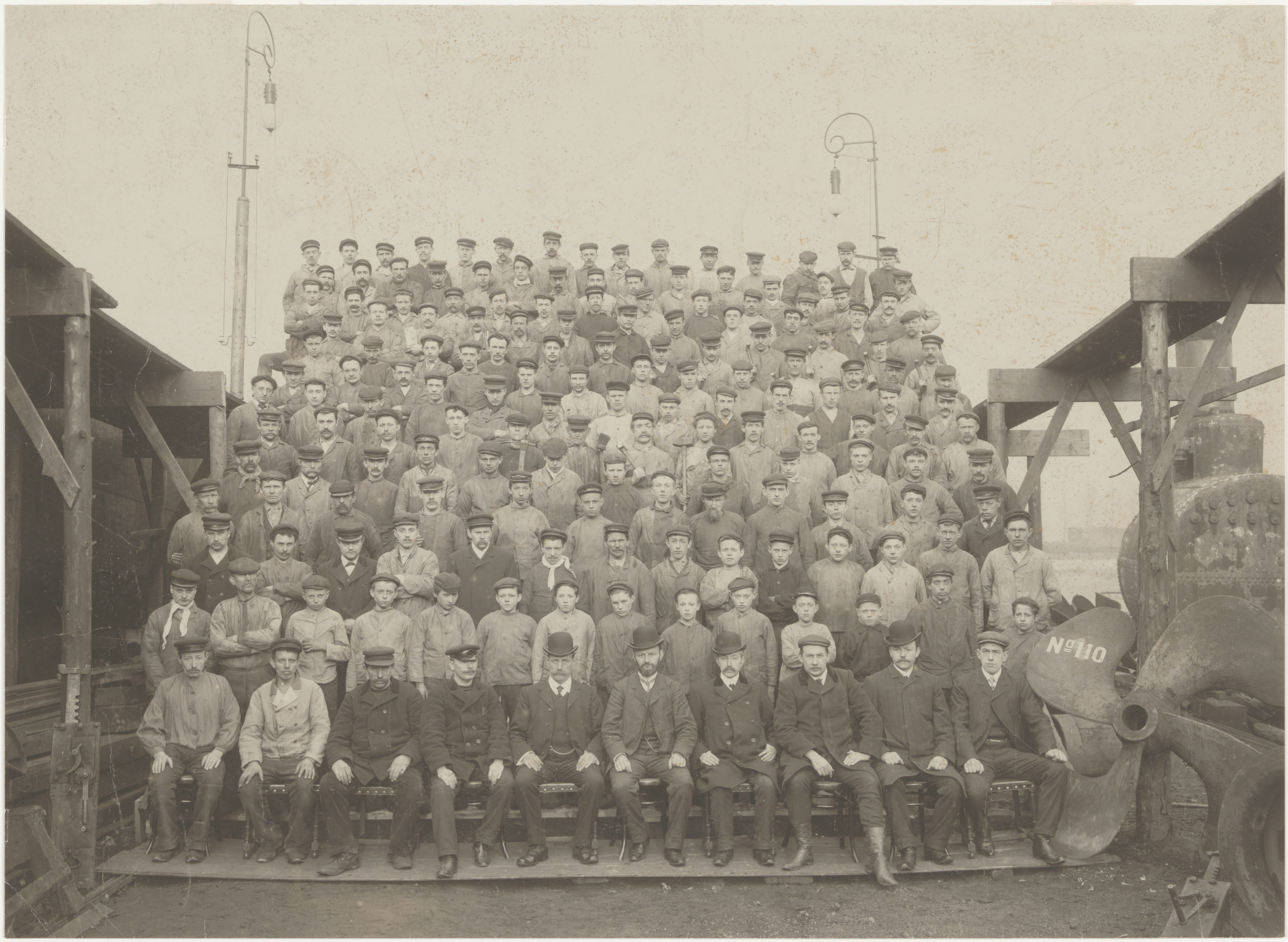 Groepsfoto van directie en personeel der machinefabriek Huiskens en van Dijk aan de …
