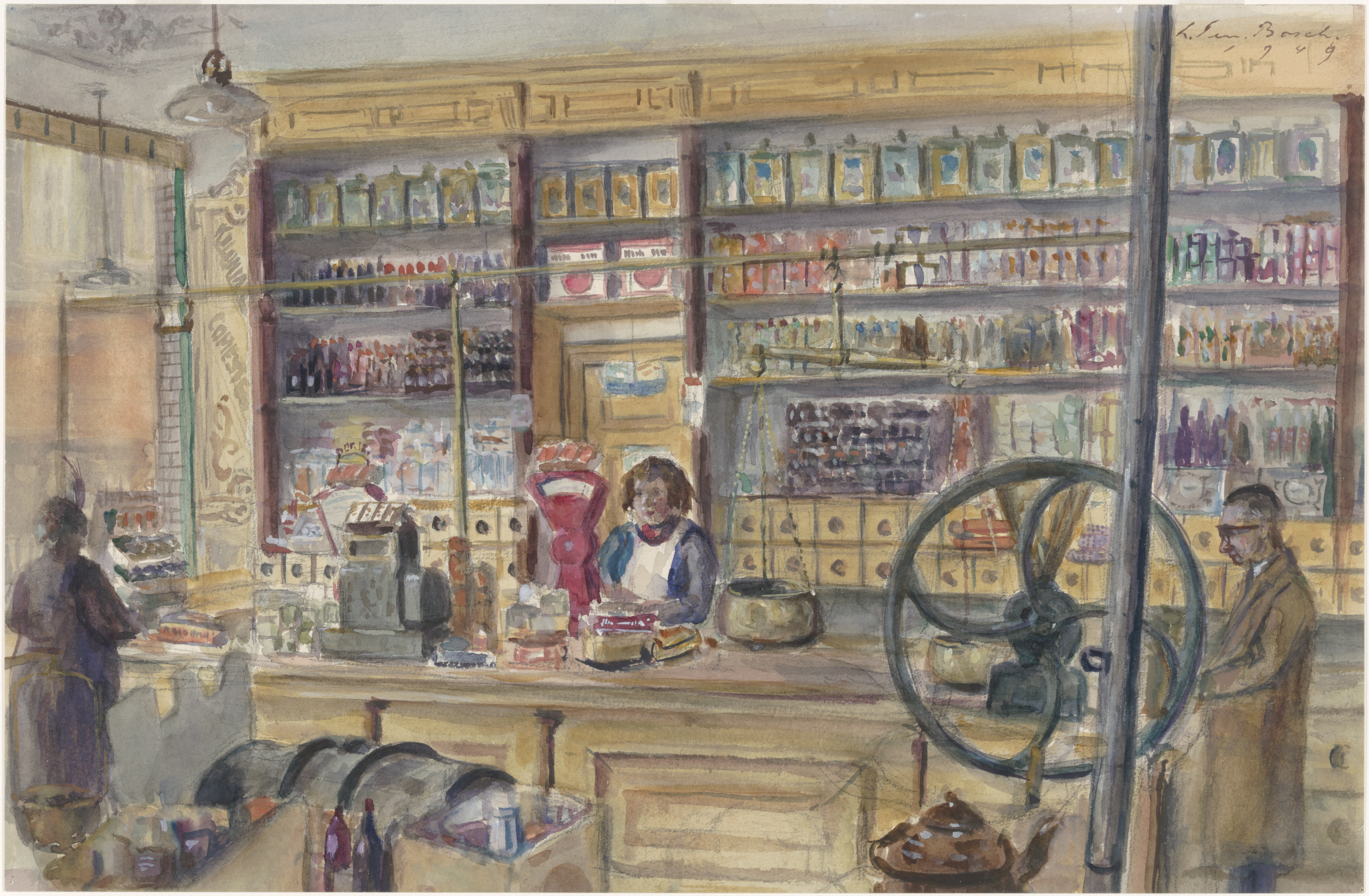 - Het interieur van de winkel van koloniale waren van Linders op de hoek van de Voorstraat en de Ruitenstraat. Rechts in stofjas de mede-eigenaar Petrus Joannes Marie Linders.