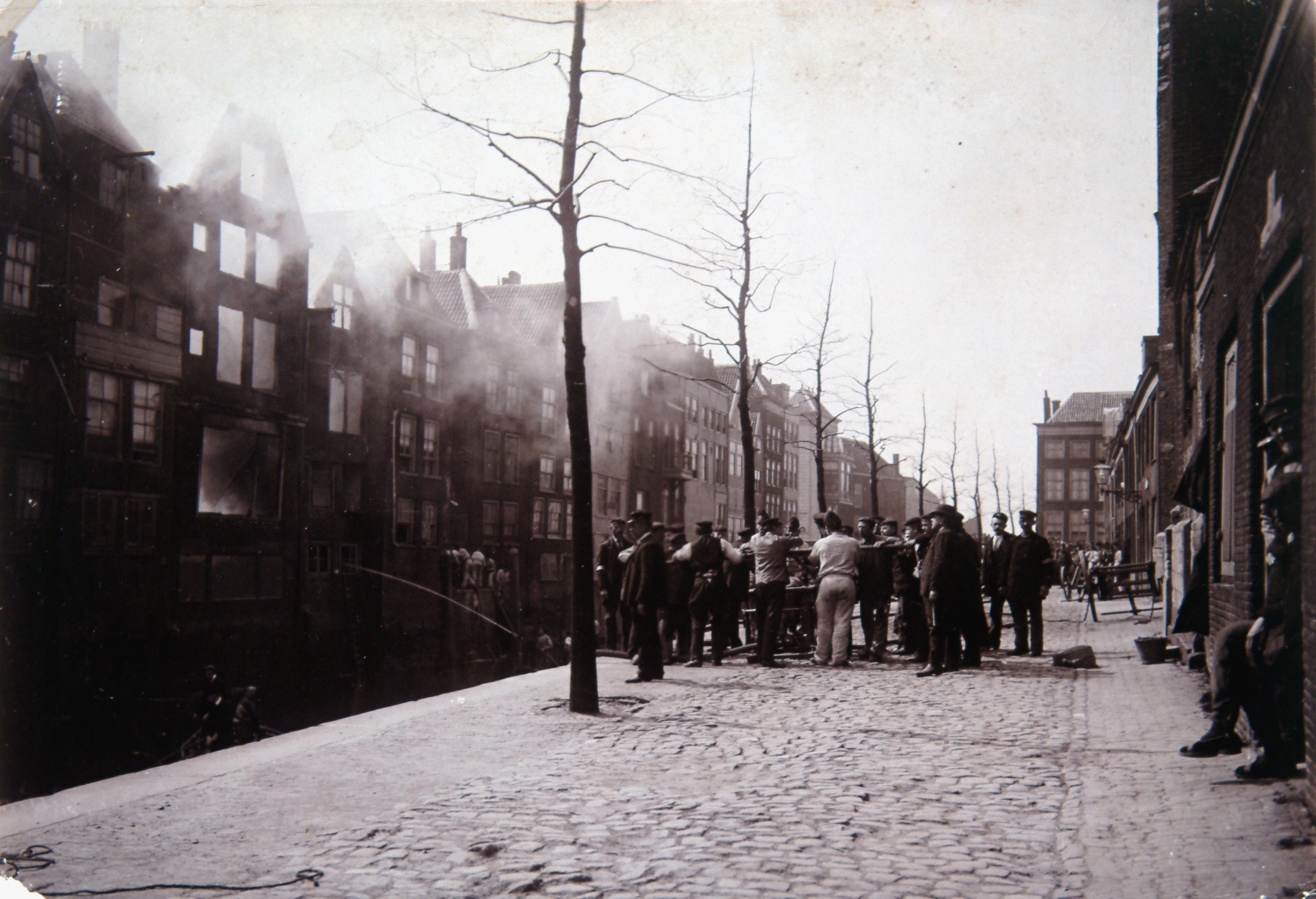 De brandweer met hulp van enkele pontonniers bestrijden de brand vanaf de Pottenkade …