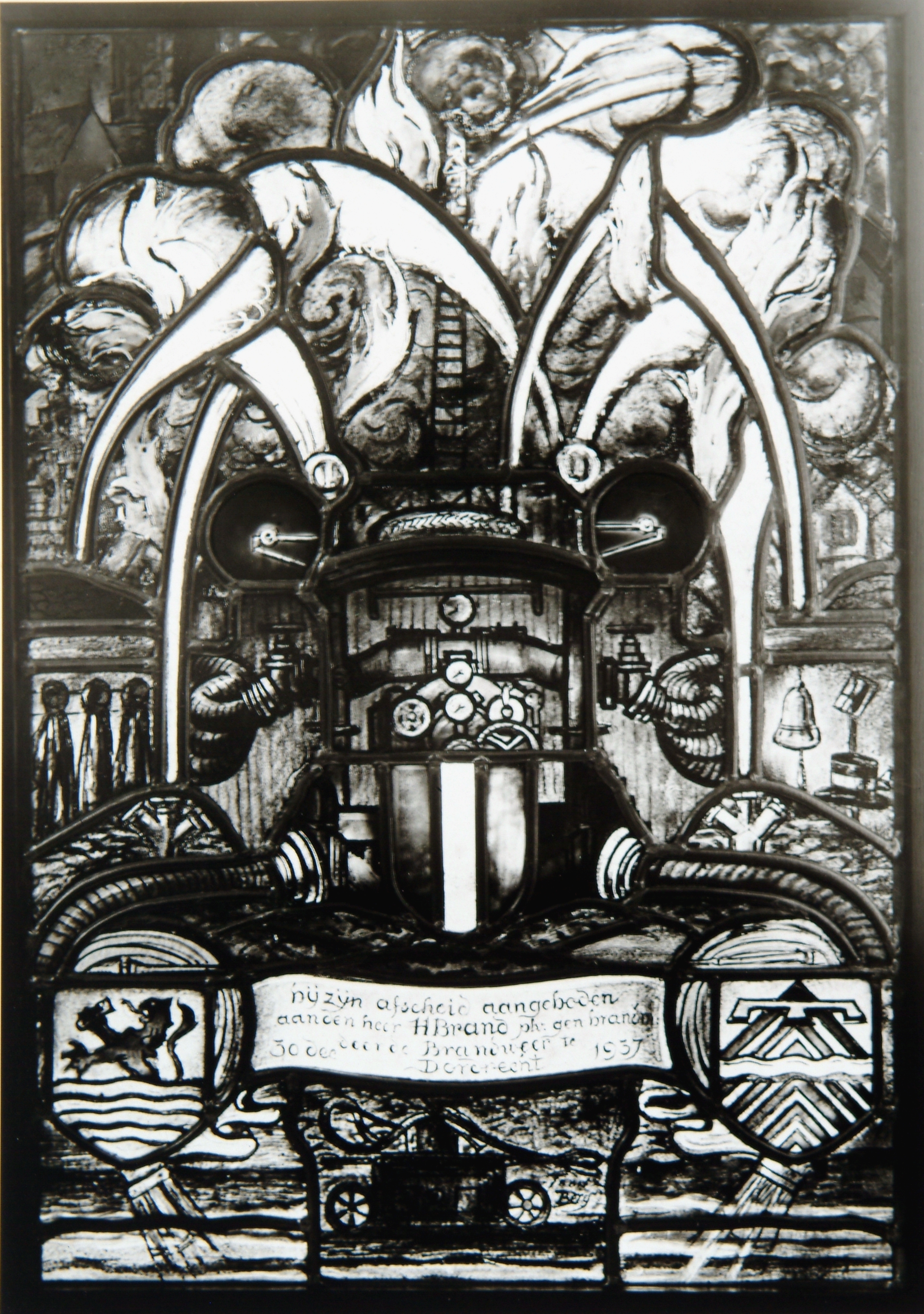 - Gebrandschilderd raam, aangeboden aan H. Brand bij zijn afscheid als vervangend generaal-brandmeester.