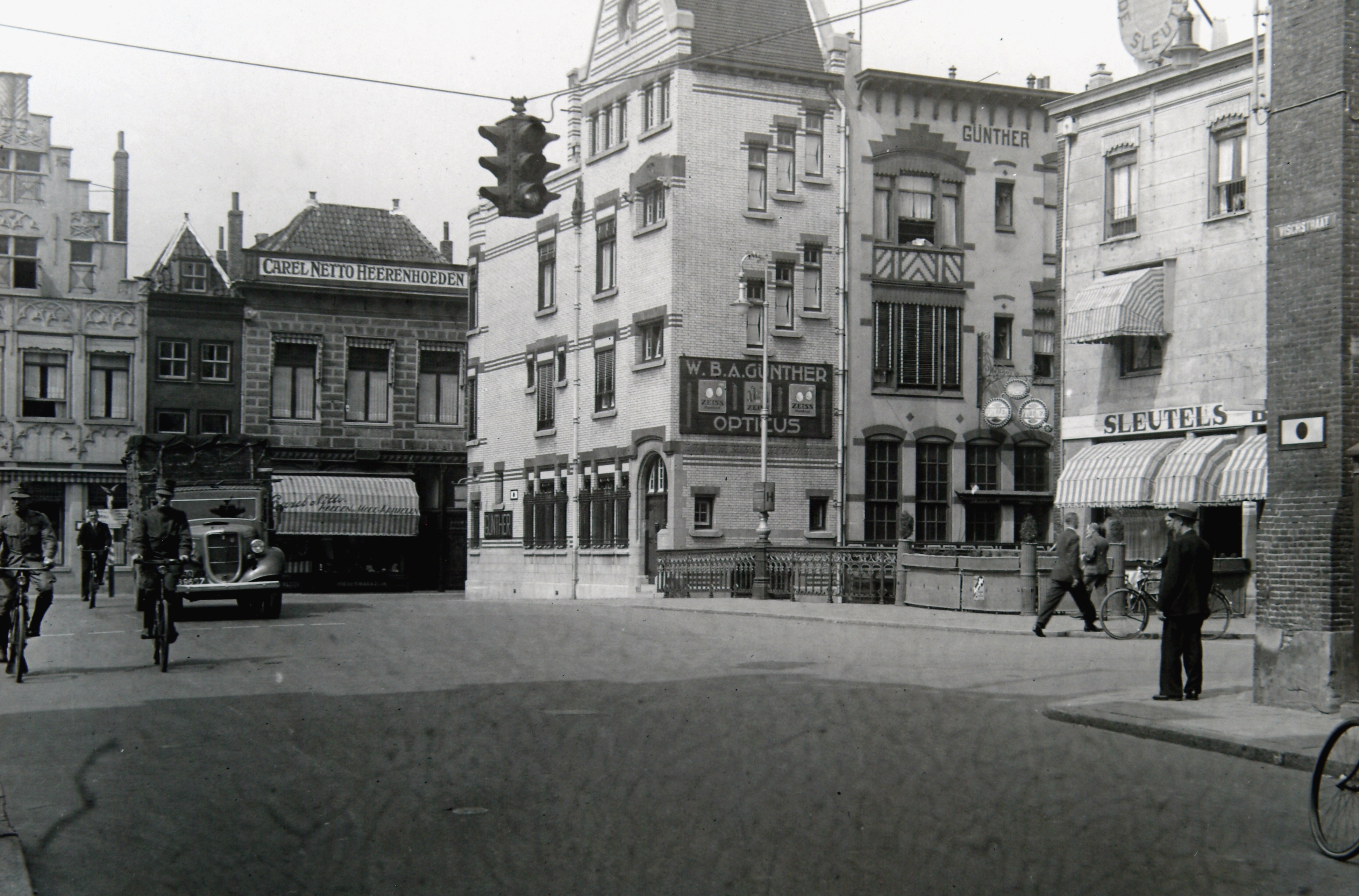 - bruggen cafés militairen / soldaten opticiens verkeerslichten voetgangers vrachtwagens