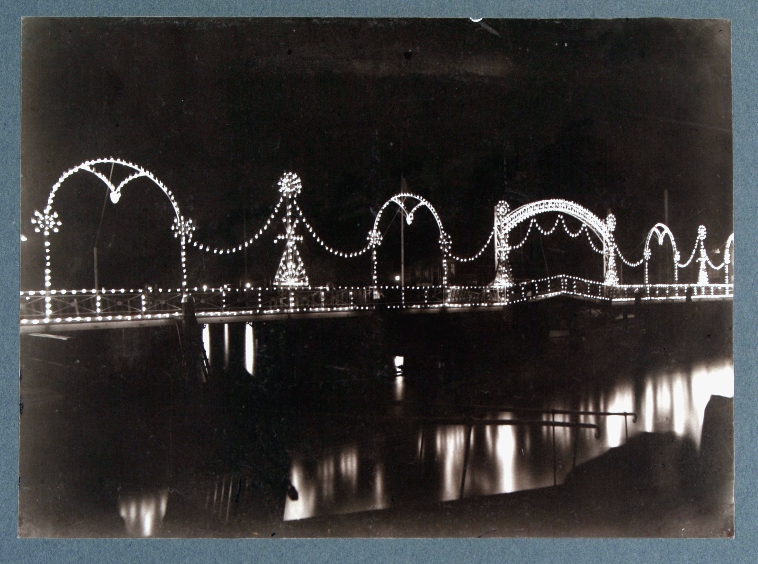 Feestverlichting op de Lange IJzerenbrug over de Nieuwe Haven.