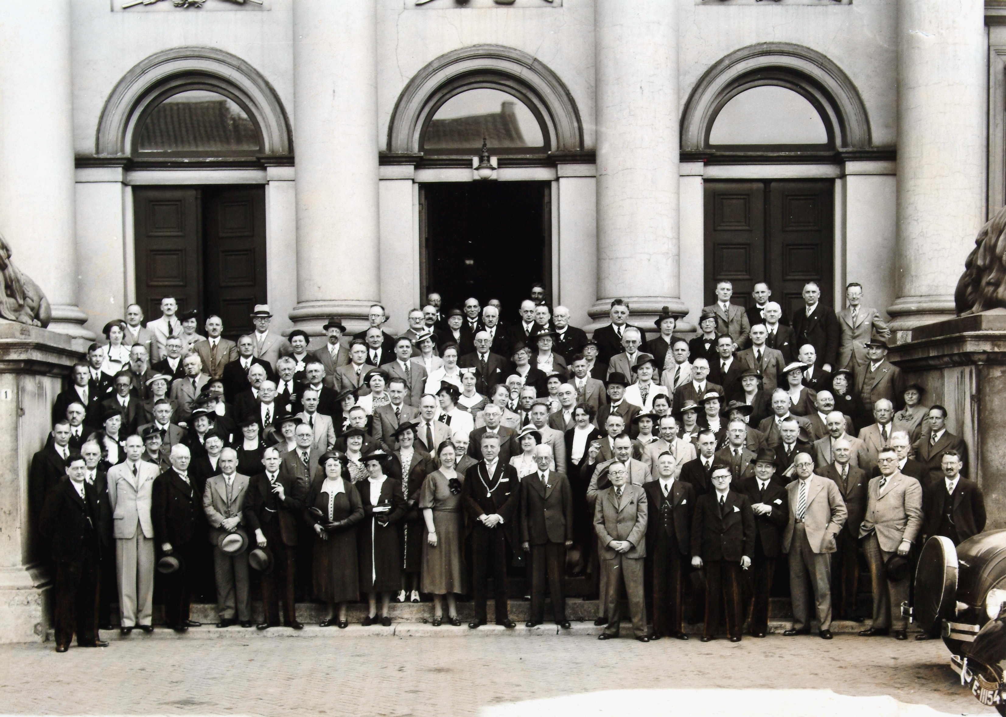 De deelnemers van het banketbakkerscongres met burgemeester Bleeker op de trappen van …