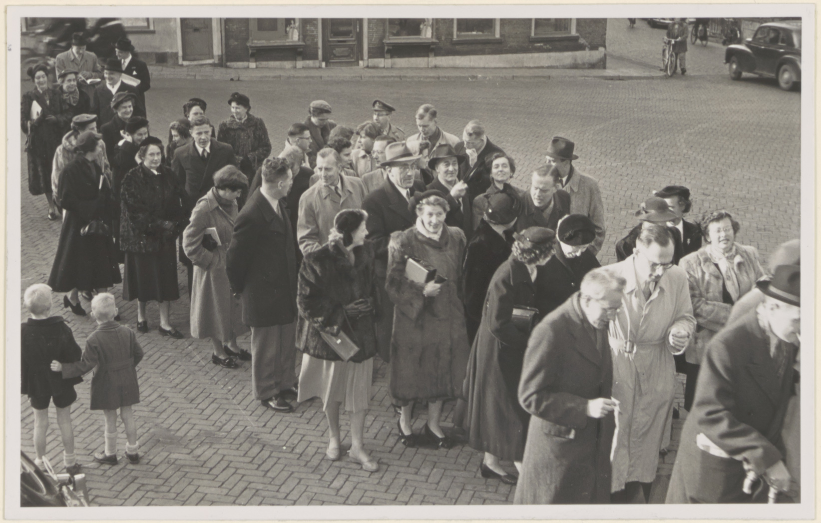 - Genodigden op het Stadhuisplein voor de herdenkingsplechtigheid naar aanleiding van het zevenhonderdjarig bestaan van het hoger onderwijs in Dordrecht.