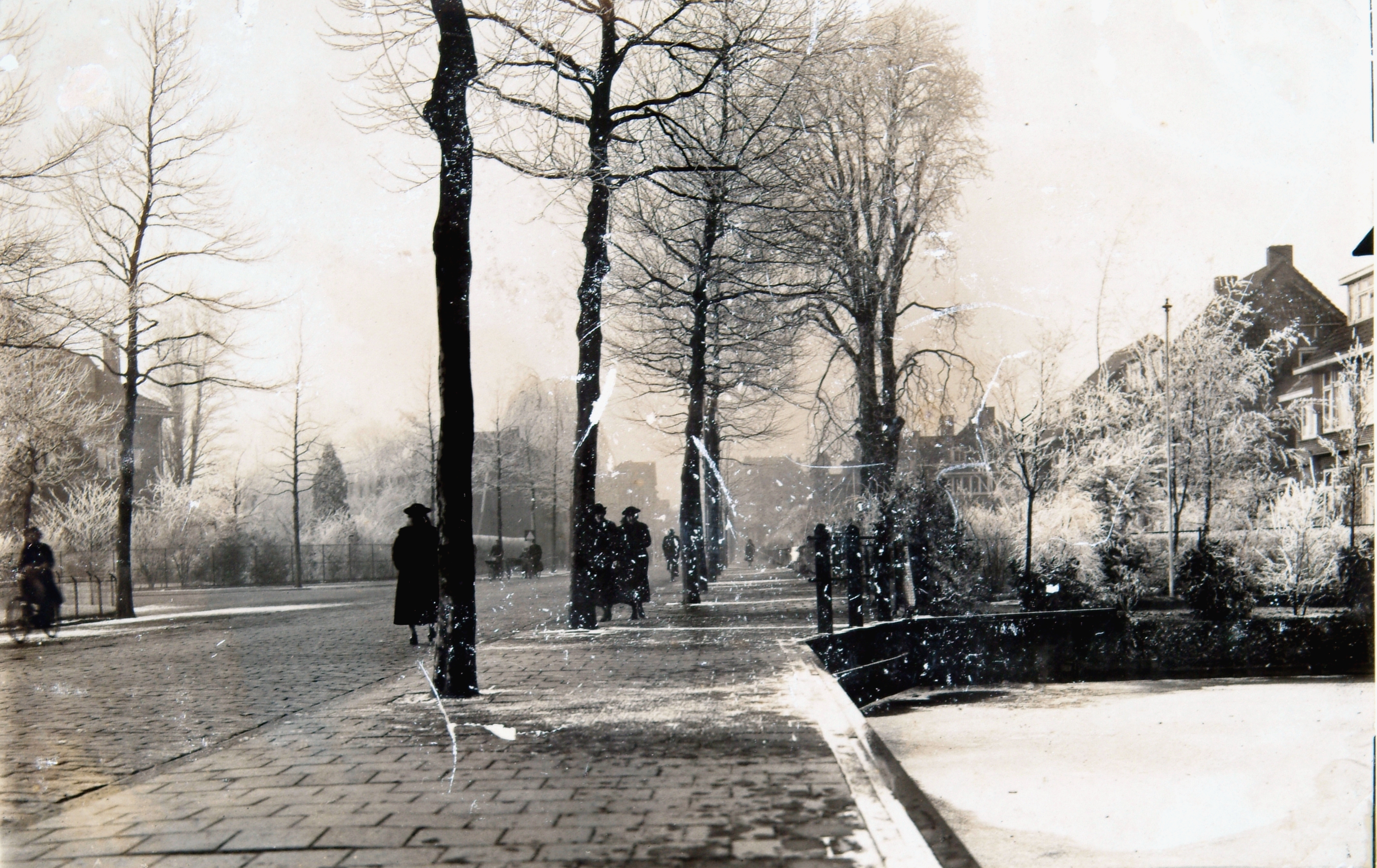 - De Vrieseweg vanaf Park Merwestein met de bevroren buitensloot in de richting van de Singel. Links het Oranjepark.