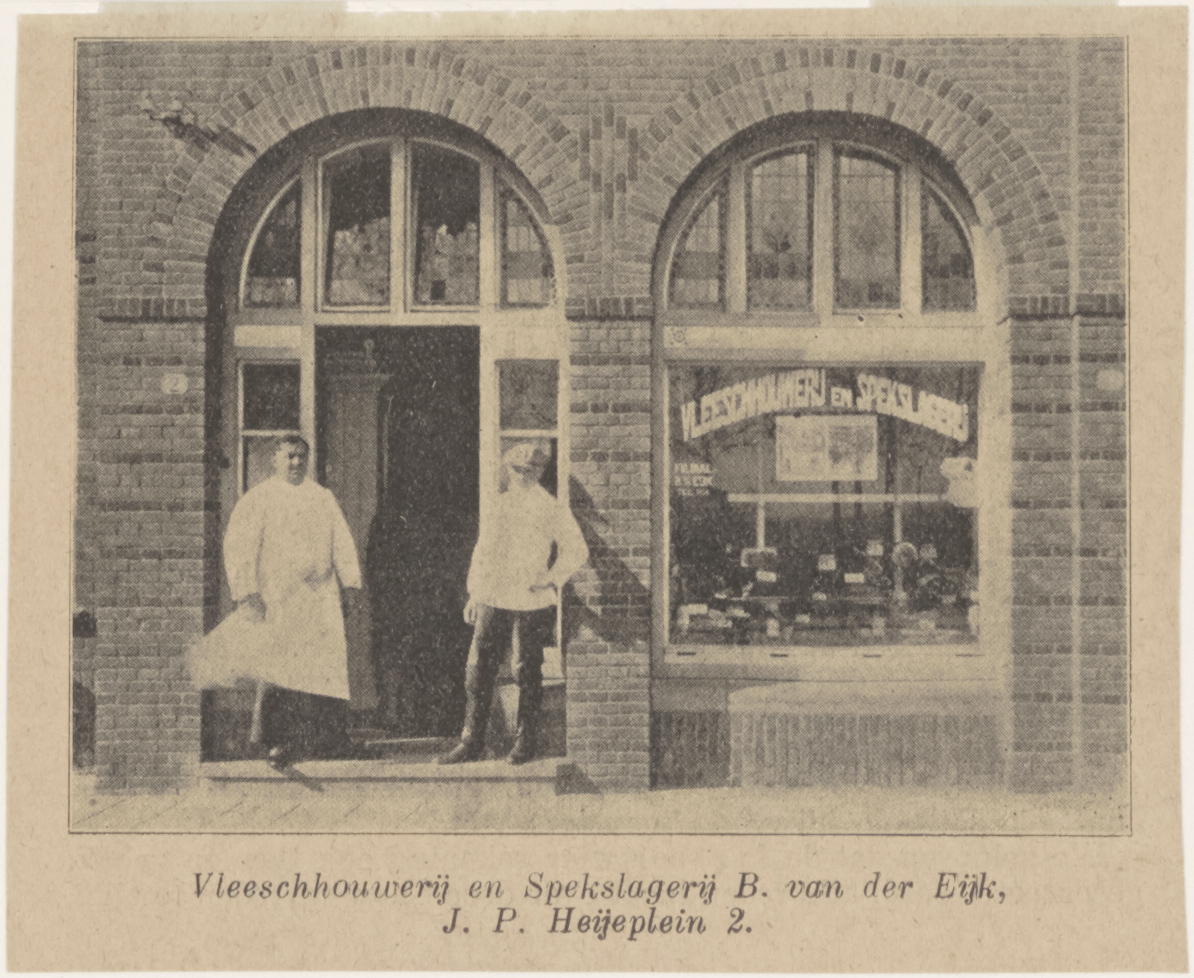 - Onderpui van de vleeshouwerij en spekslagerij van B. van der Eijk aan de westzijde van het J.P. Heijeplein.