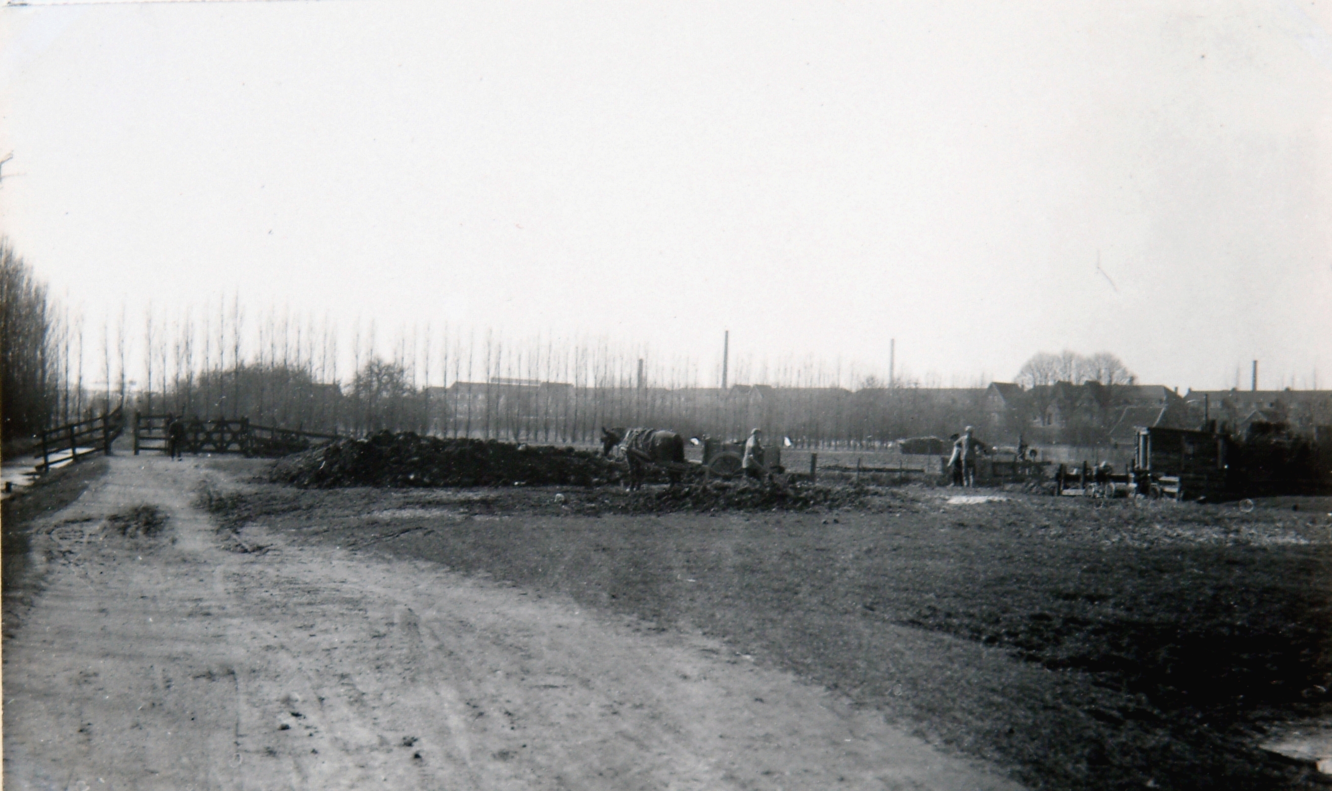Gezicht op de Watermolenweide gaande langs de bocht in de richting van de Weeskinderendijk. Grondwerkers zijn bezig het terrein voor bebouwing voor te bereiden.