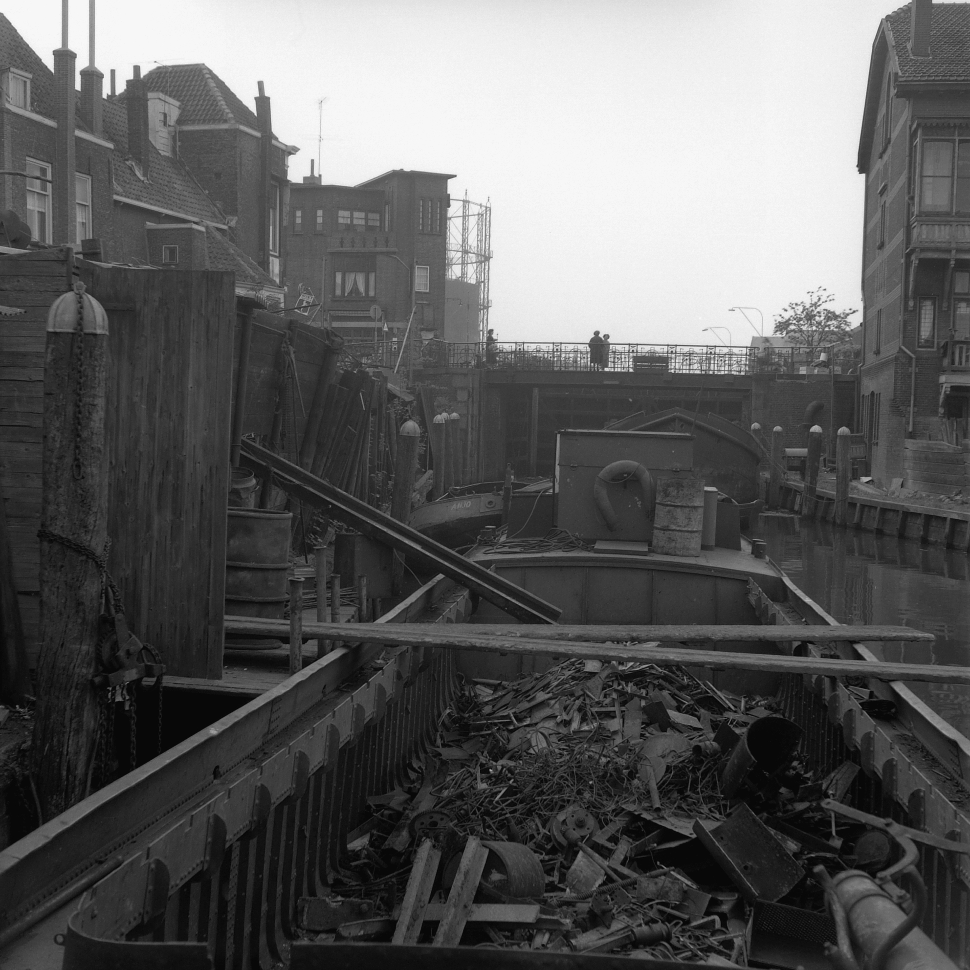 Deze foto is genomen net nadat de hefboom van de brug was verwijderd. Op de achtergrond zie je de gashouder aan de Riedijkshaven