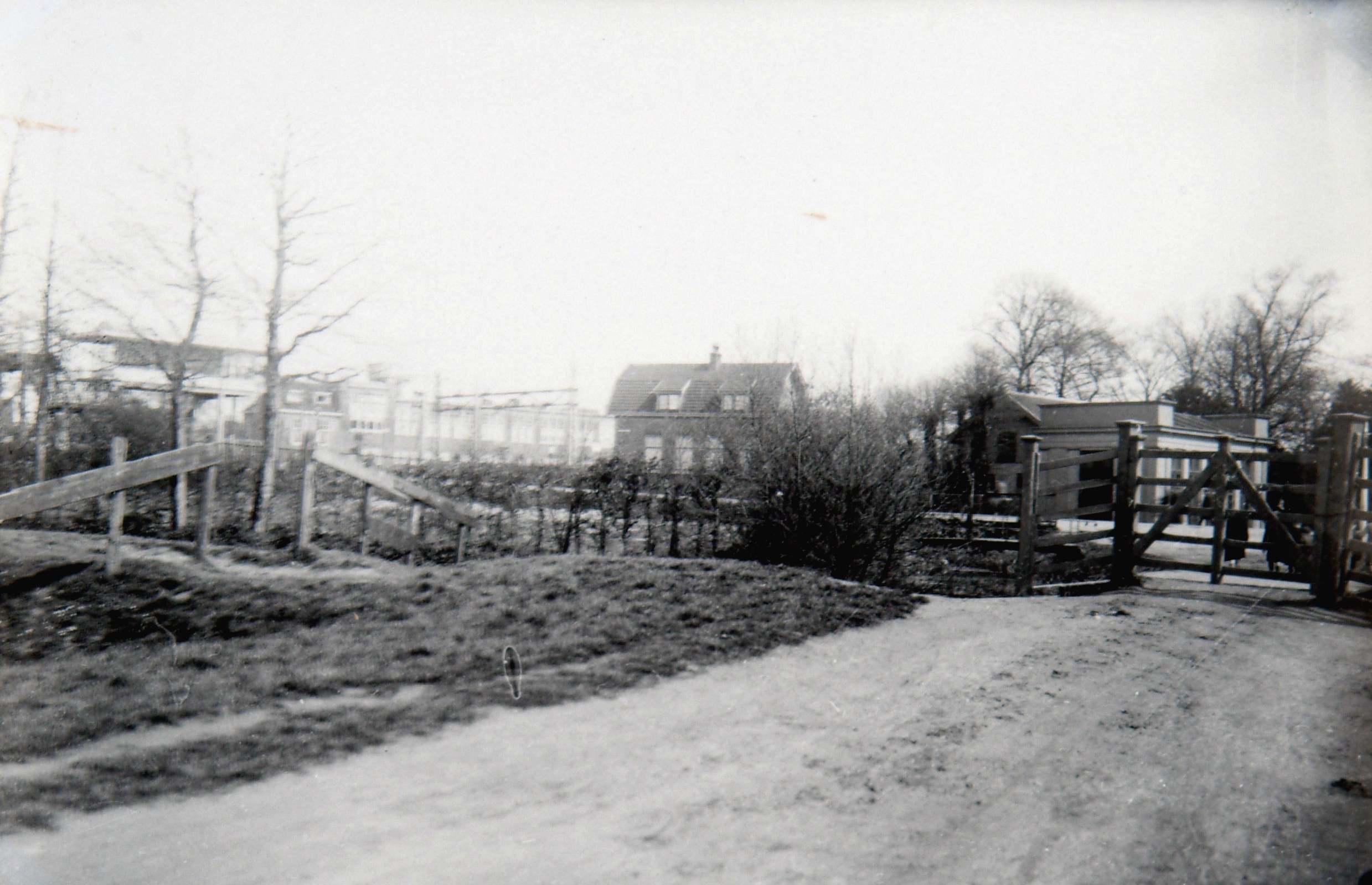 - De Watermolenweide in de richting van de spoorwegovergang Spuiweg/Krispijnseweg. Rechts het toegangsshek tot de Watermolenweide, daarachter de oranjerie die hoort bij de villa van De Roo. Het huis middenin is de spoorwachterswoning en links staat het seinwachtershuis.