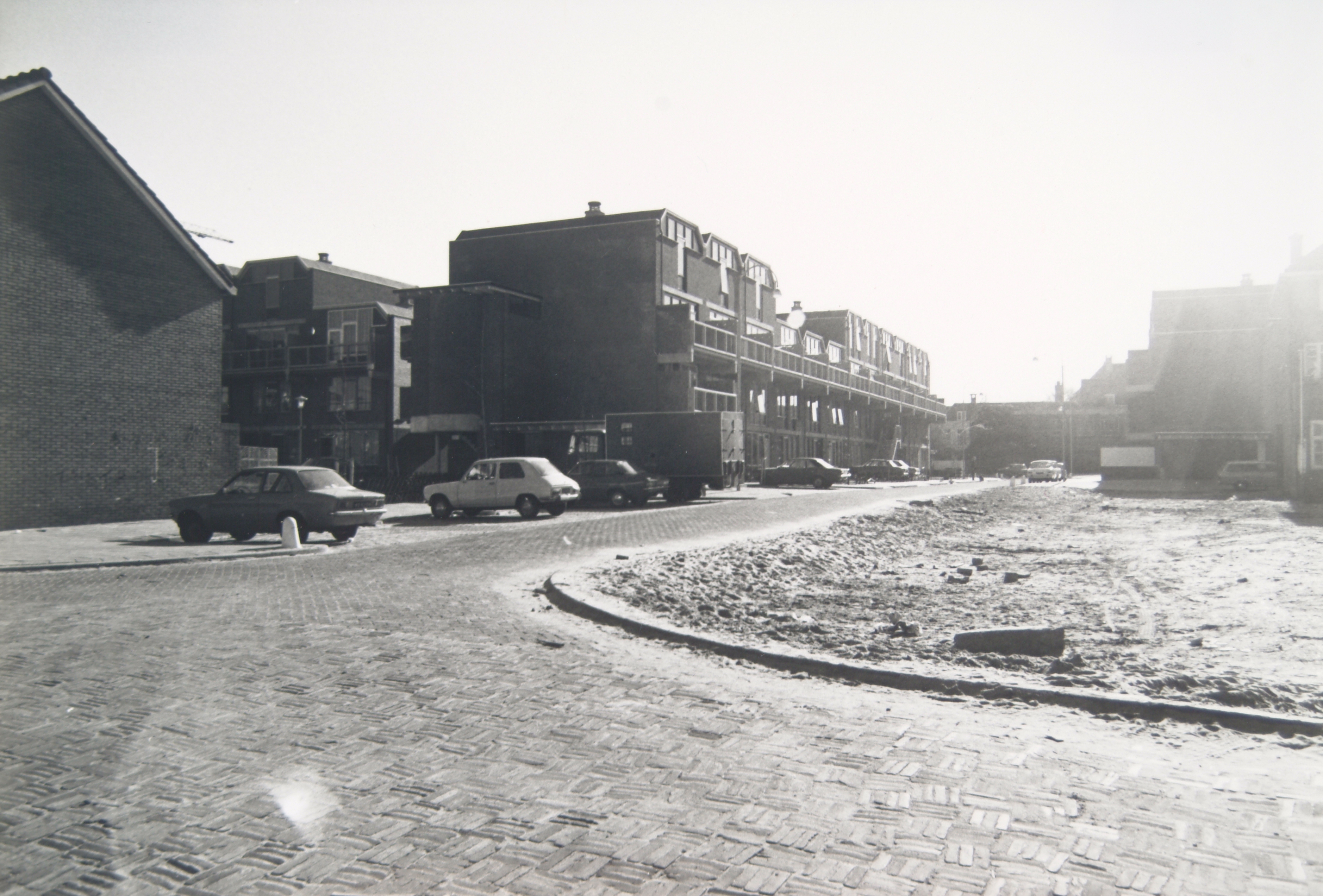 - De Vrankenstraat tijdens nieuwbouw van de wijk Bleijenhoek, ontworpen door architect C. Weeber, gezien vanuit de Heer Heymansuysstraat. De vrachtwagen rijdt de Meivogelhof in.