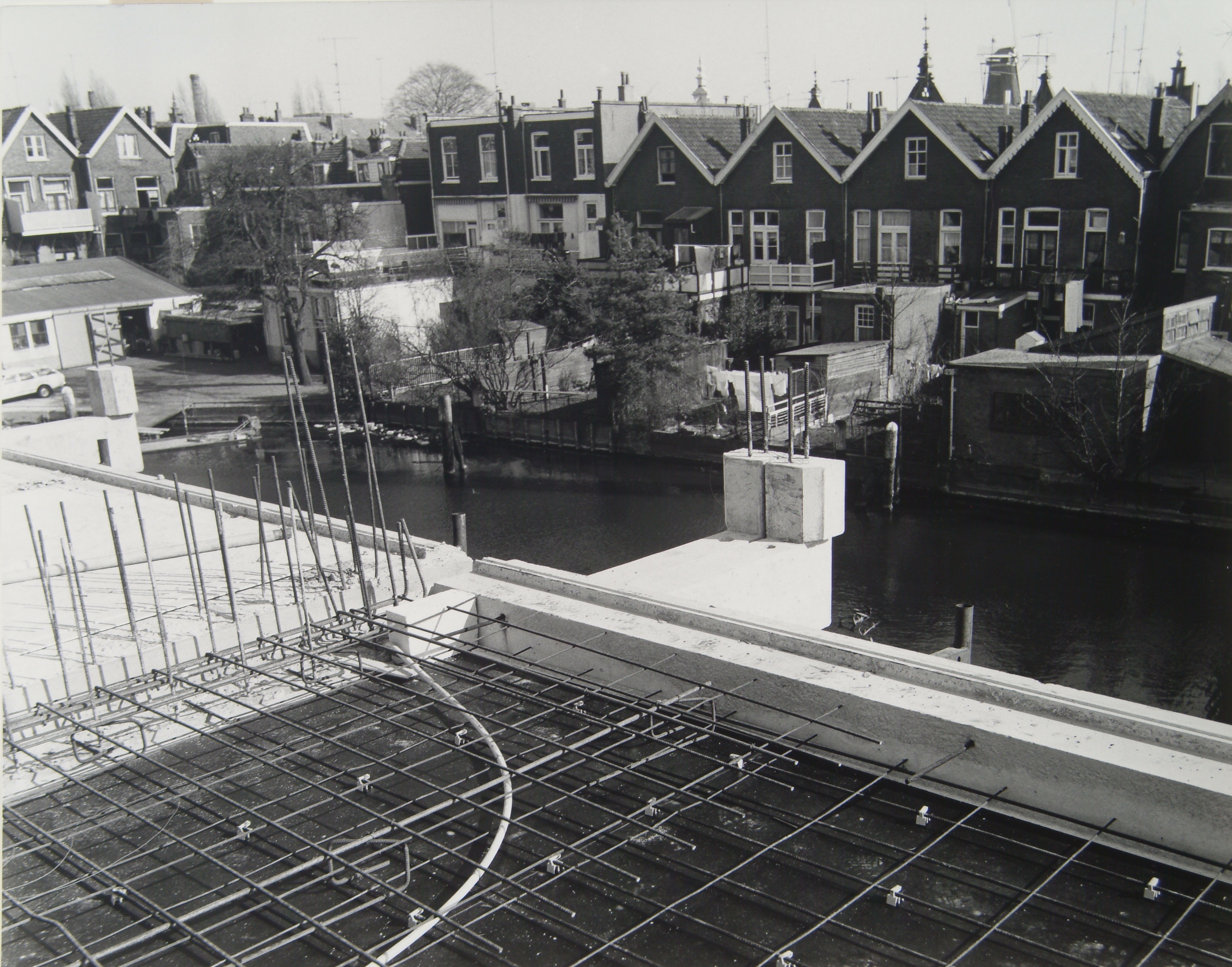 Nieuwbouw van de Veststraat in de wijk Bleijenhoek, ontworpen door architect C. Weeber, gezien over de Spuihaven naar het Kromhout. Molen Kijck over den Dijck op de achtergrond.