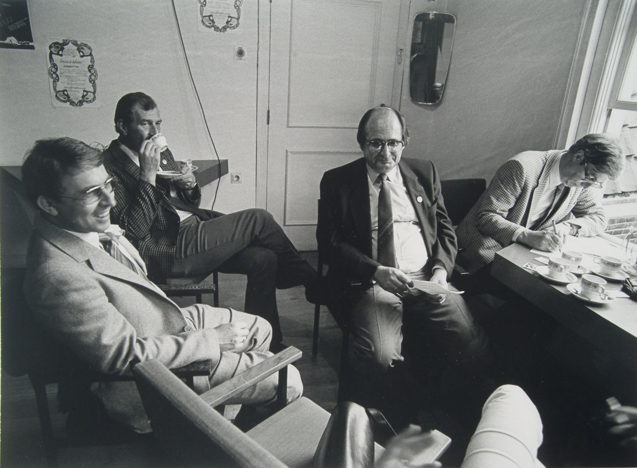 - Wachtende wethouders in Het Hof voor opnamen van de lokale televisie rondom de gemeenteraadsverkiezingen. V.l.n.r. Wurth (CDA), Meelker (PvdA), Janse (PvdA) en De Kovel (CDA).